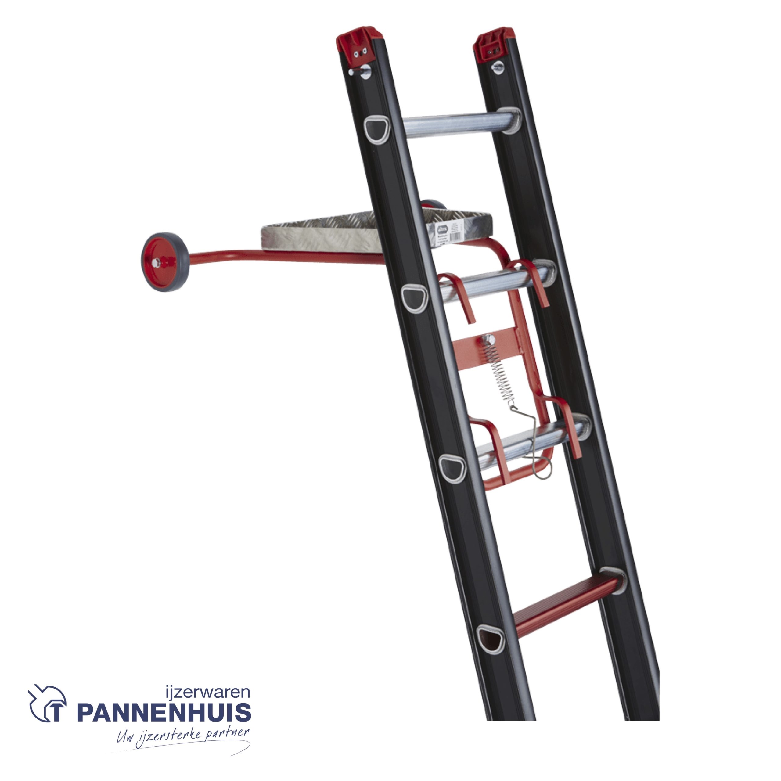 De Muurafhouder met toprollen en bakje is een slimme toepassing die je kunt gebruiken op elke professionele ladder. Doordat je meer afstand van de gevel hebt kun je de klus gemakkelijker uitvoeren. De toprollen maken het uitschuiven van je ladder heel makkelijk. En met het bakje heb je een handige plek voor je gereedschap. Dat is veilig. Een waardevolle toevoeging voor elke ladder.