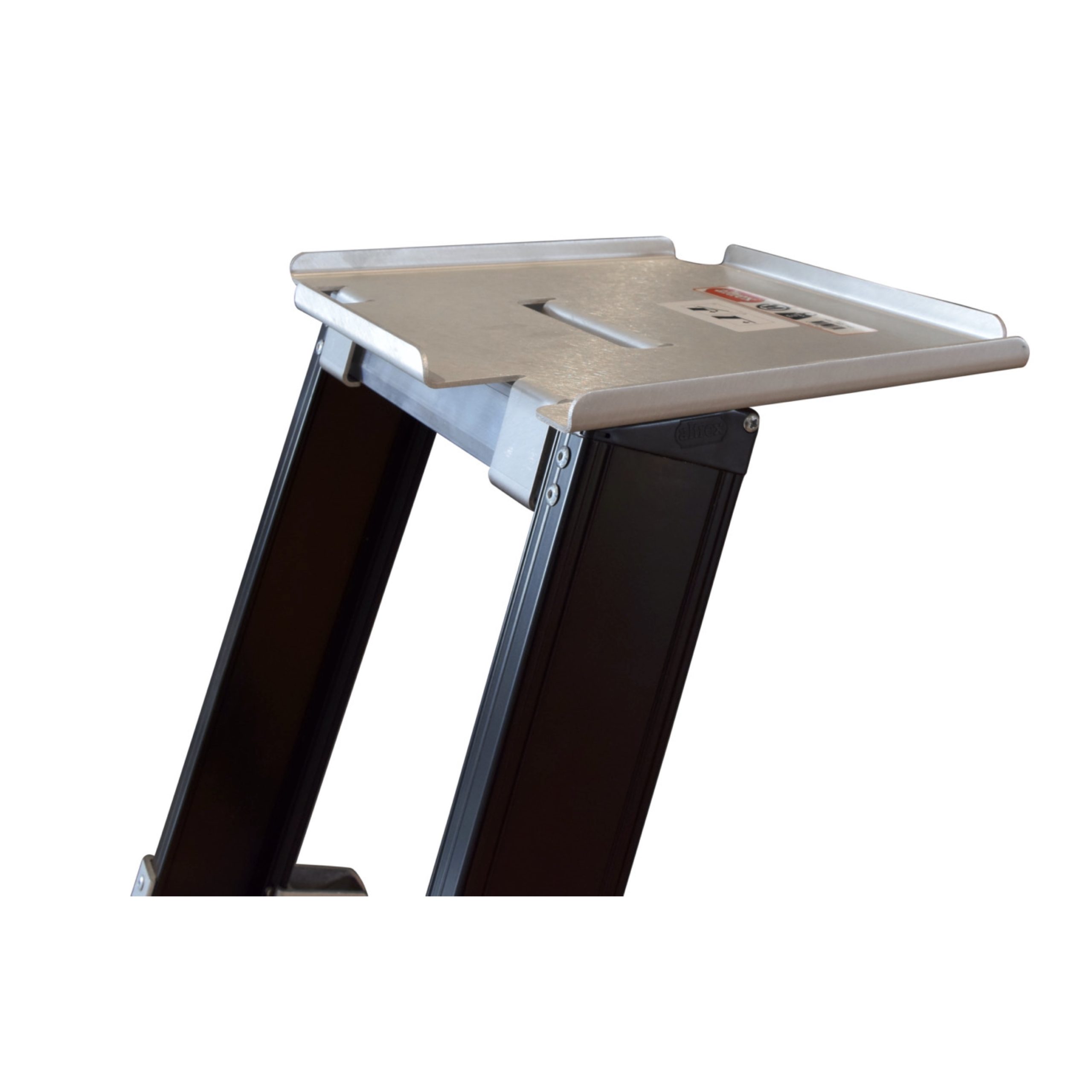 Het plateau is een handige accessoire voor je Taurus, Falco, Eifel of Sierra enkel oploopbare trap. Dit plateau klik en klem je eenvoudig vast aan je trap. Hiermee heb je altijd een handige plek voor je gereedschap, verfblikken en verfemmers tot en met 14 liter. Het plateau heeft een maximale belasting van 25 kg. Het plateau maakt werken op hoogte een stuk gemakkelijker.