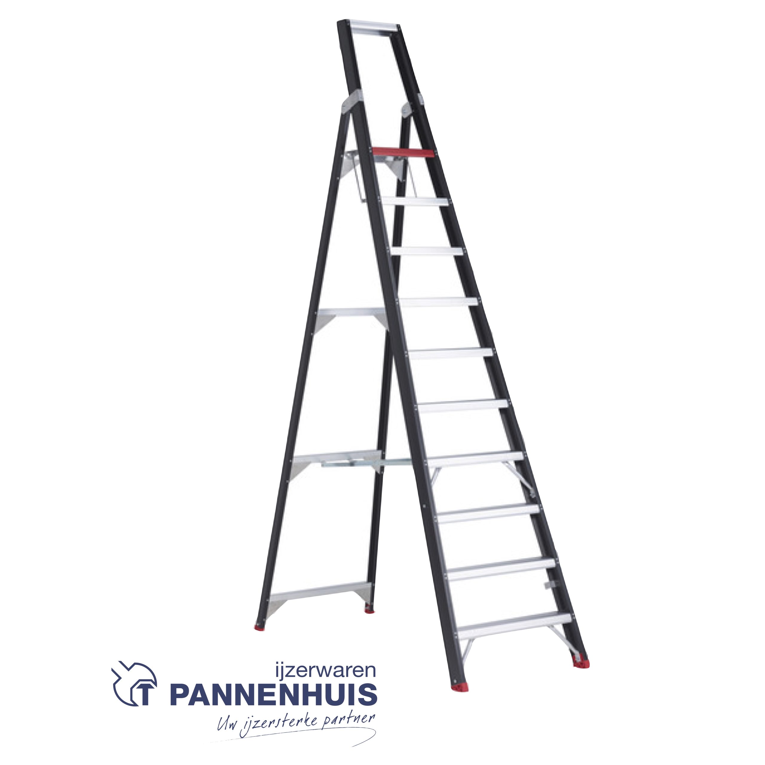 De vuilafstotende zwarte coating maakt deze trapladder geschikt voor elke professionele klus.