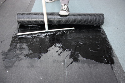 6. Rol een volledige dakrol (polyester- en/of glasvliesinlage) direct uit in de juist aangebrachte lijm en druk aan.