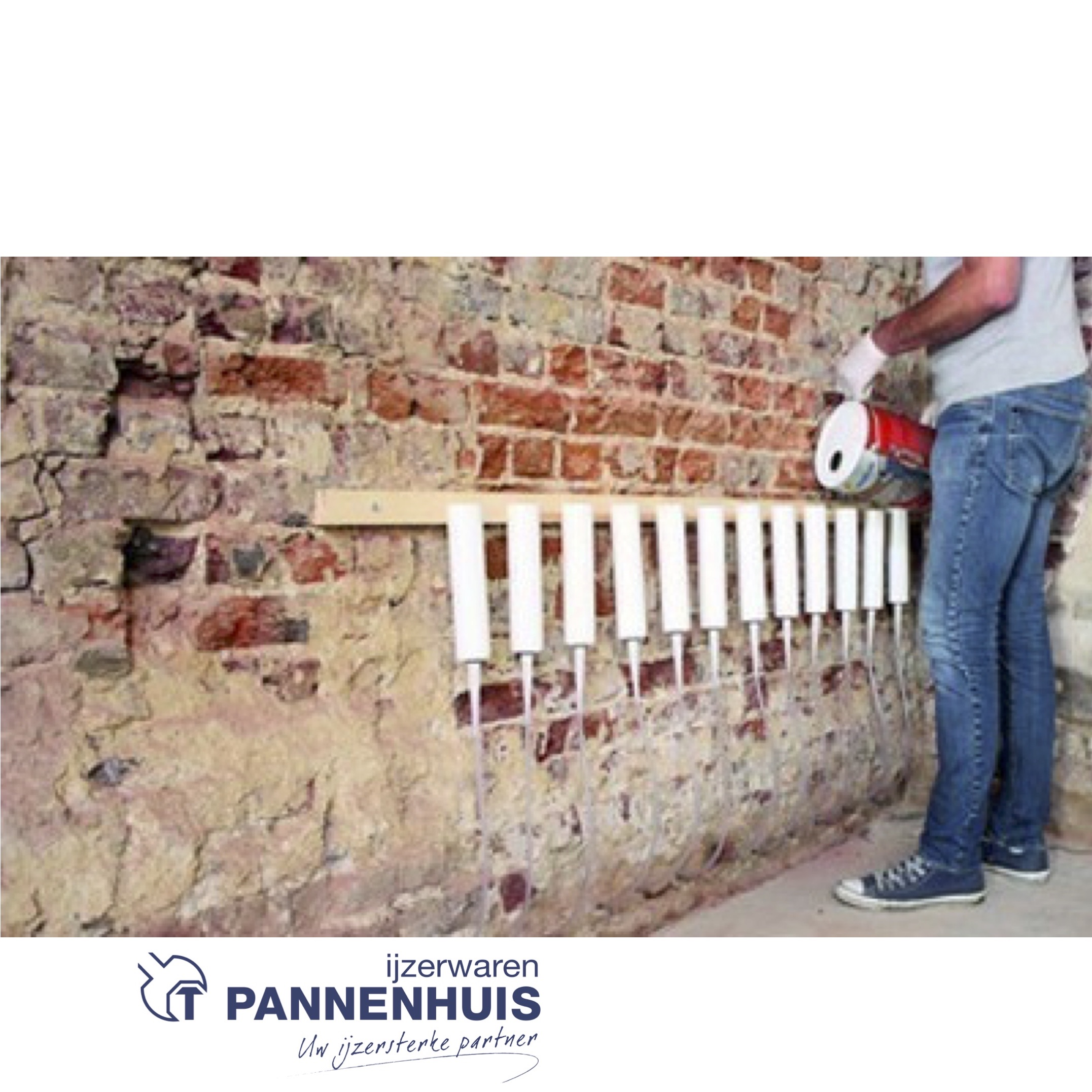 Een kleurloze professionele injectievloeistof die een definitieve behandeling tegen opstijgend vocht garandeert van bovengrondse binnen- en buitenmuren. Het vormt een levenslange waterdichte barrière die het opstijgend vocht belet verder door te dringen.
