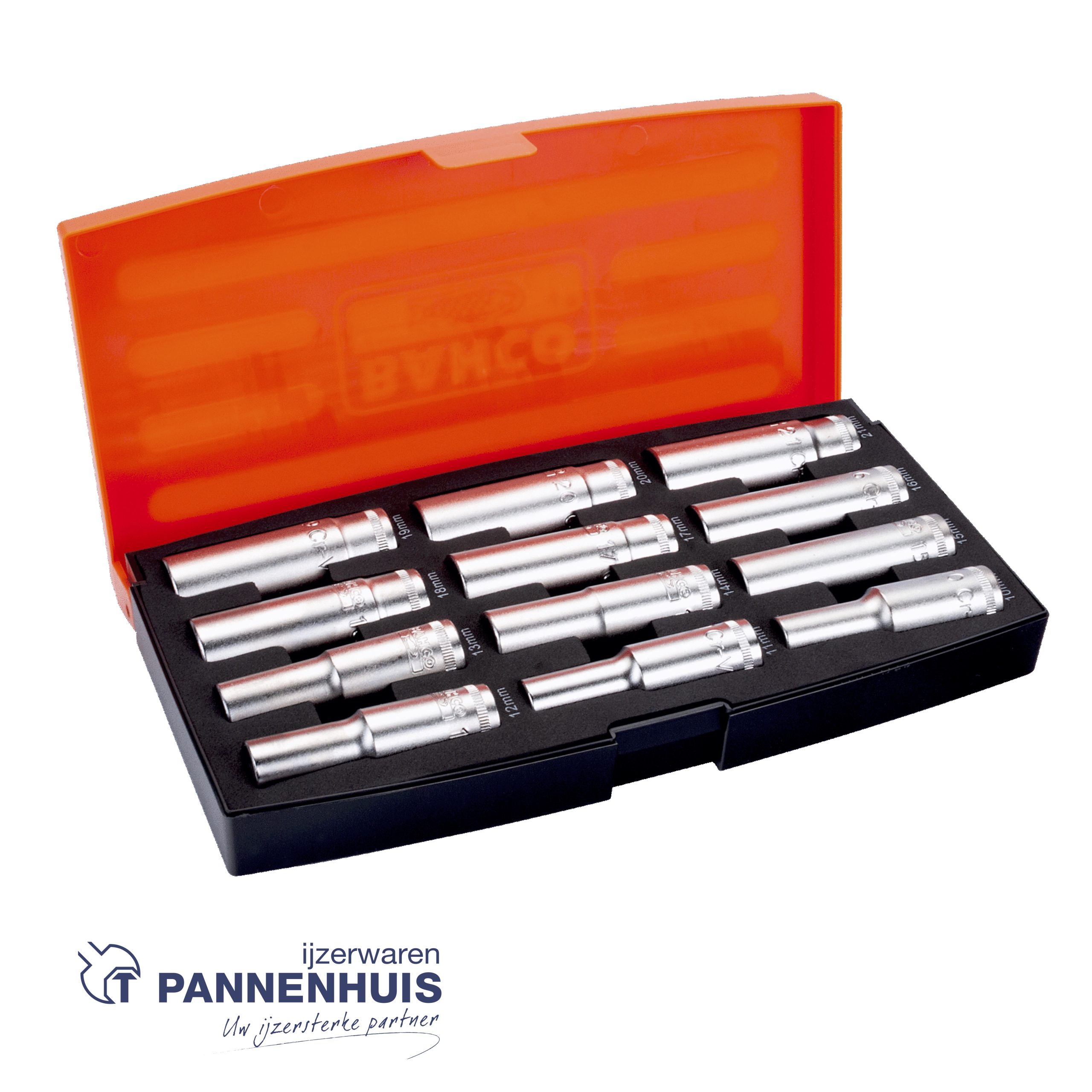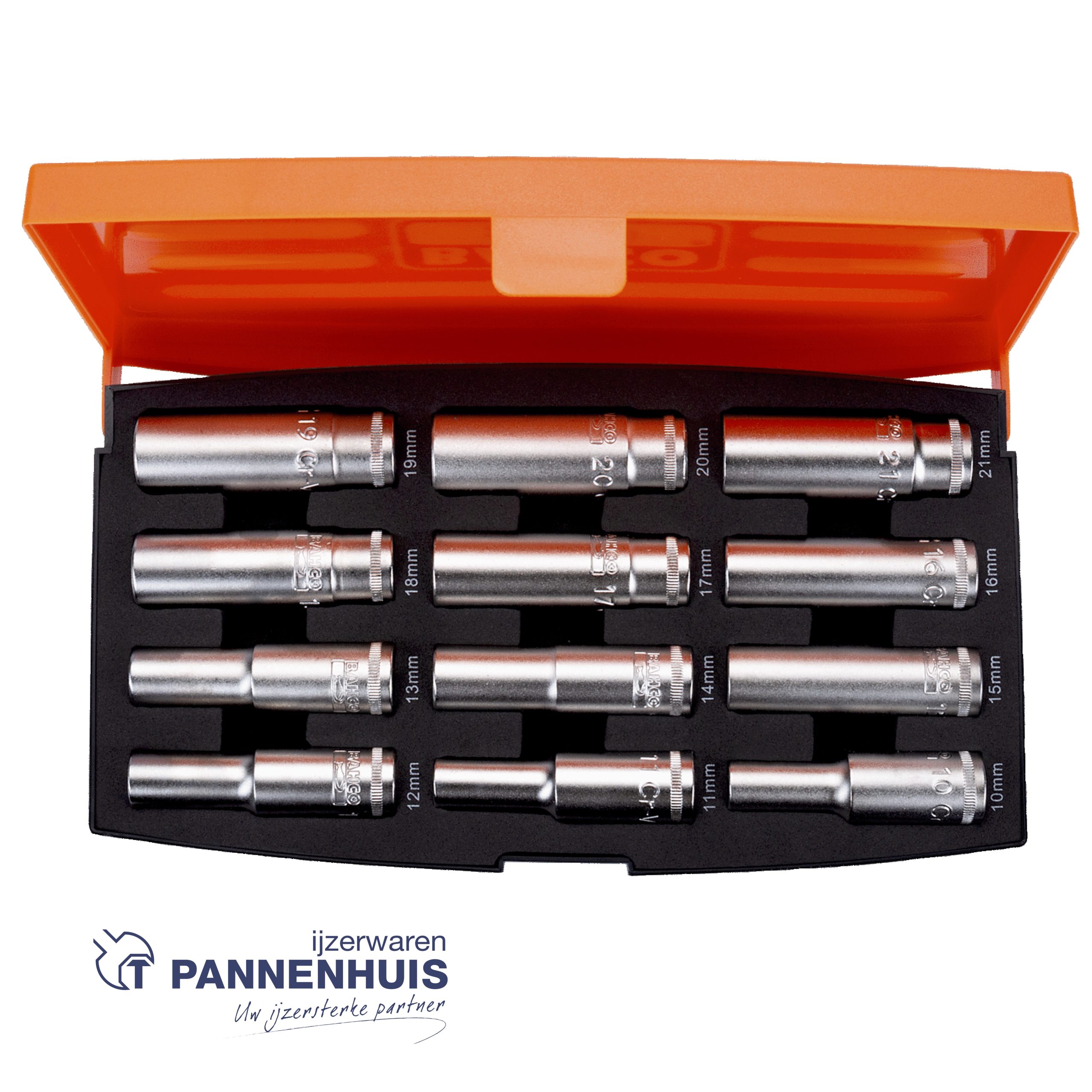 12 lange doppen 1/2″ zeskant: 10, 11, 12, 13, 14, 15, 16, 17, 18, 19, 20, 21 mm