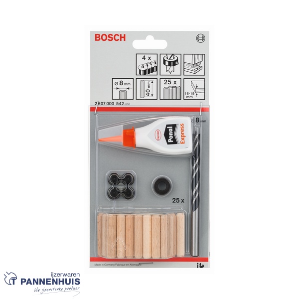Wordt geleverd met een boor met boorpunt, dieptestop, centerpunten, gegroefde houten deuvels en houtlijm