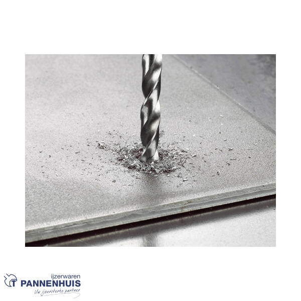 Conform DIN 338 geproduceerde boor van type N (groefhoek) met punt van 135 graden en diametertolerantie van h8.