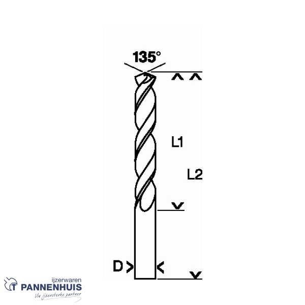 Conform DIN 338 geproduceerde boor van type N (groefhoek) met punt van 135 graden en diametertolerantie van h8.
