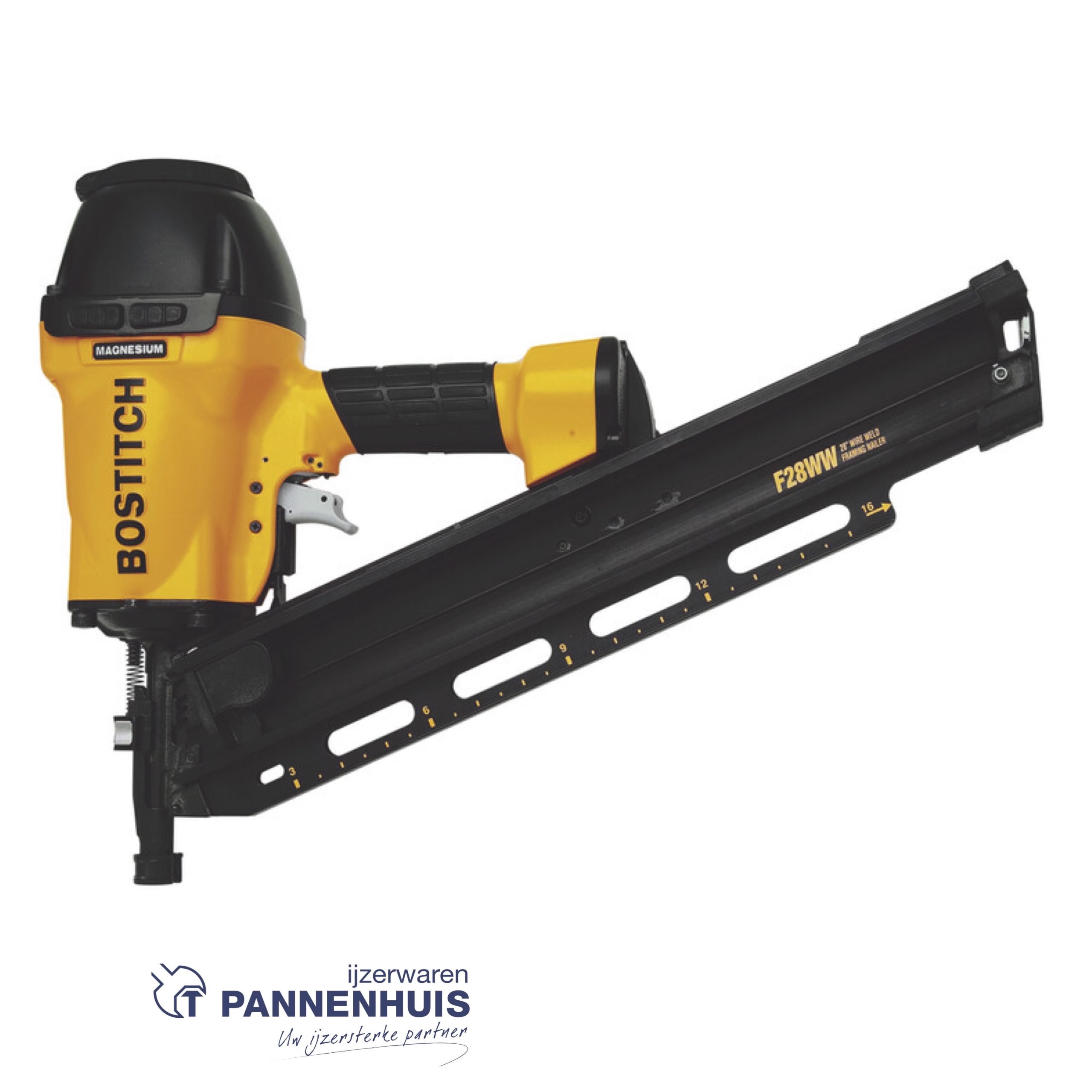 Het meest verkochte stripapparaat van BOSTITCH heeft stripnagels onder een hoek van 28°. Men kan zowel een contact als sequentiële trekker voorzien bij deze machine.