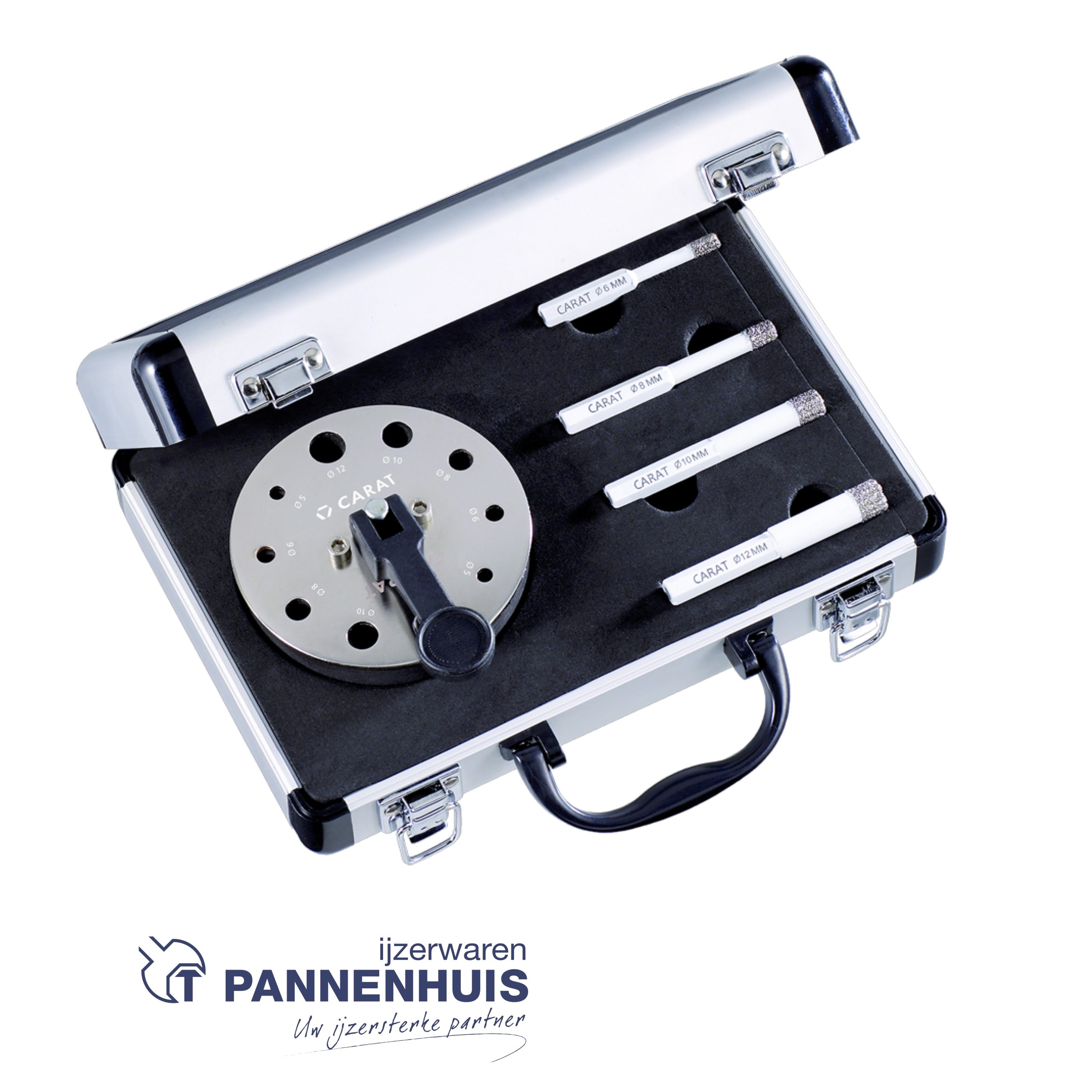 Set met 4 CARAT boren, Ø 6, 8, 10 en 12 mm en centreerhulp