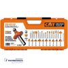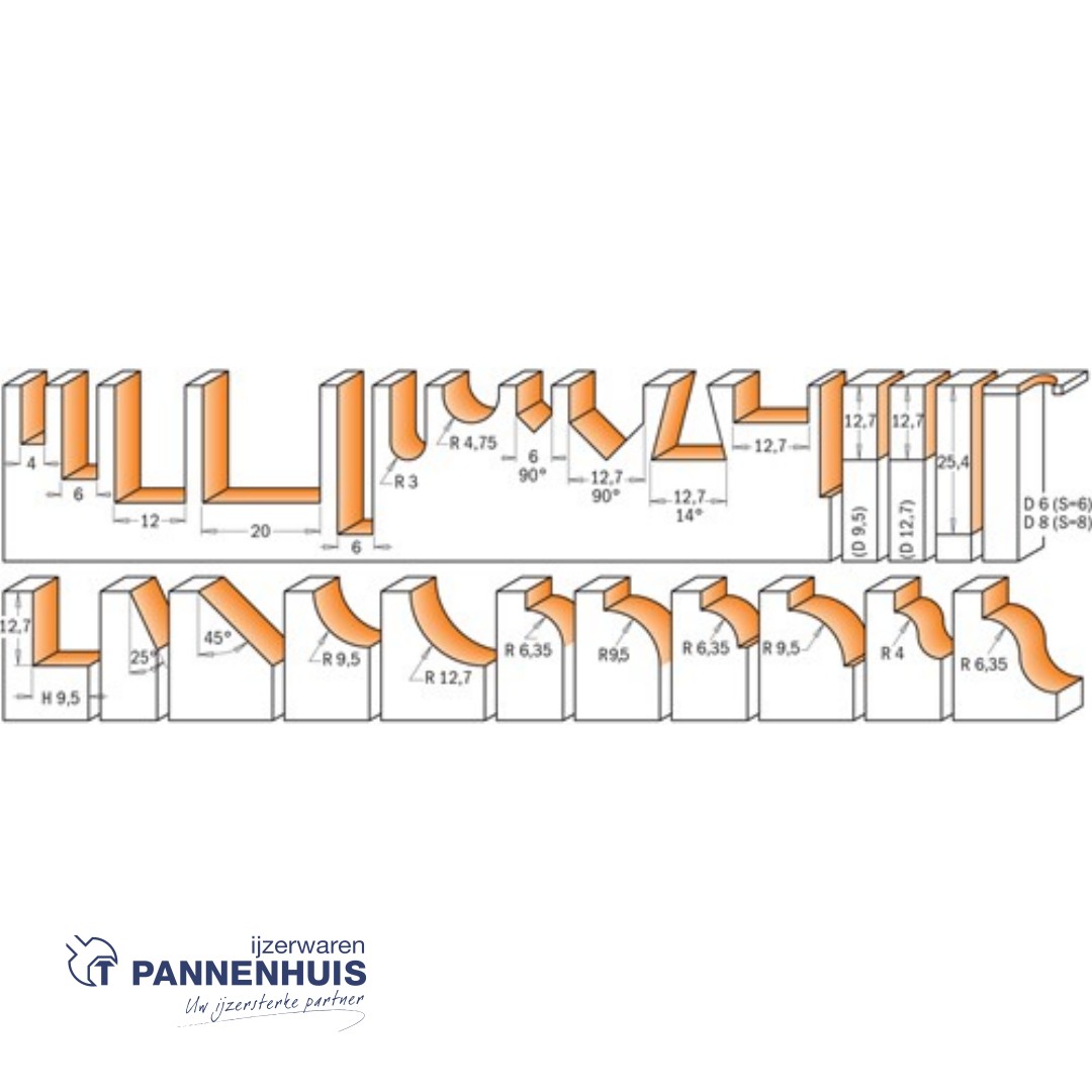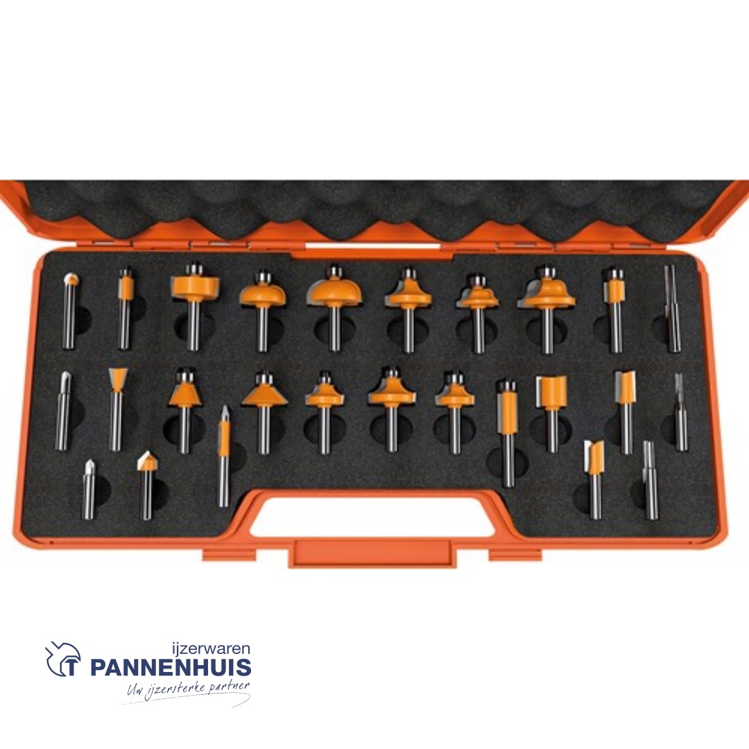 CMT heeft een complete werkplaats in een houten kist gestopt! Alle voorkomende werkzaamheden kunnen met de 26-delige set worden uitgevoerd. De set bevat onder andere groeffrezen, kantenfrezen, zwaluwstaartfrezen, afrondfrezen, sponningfrezen en profielfrezen. Uw creativiteit kent door deze set geen grenzen. Verkrijgbaar met kolf 6mm of kolf 8mm.