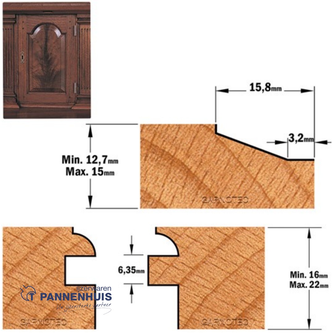 Deze driedelige freesset is ontworpen voor het maken van meubeldeuren met bescheiden afmetingen. Door de relatief kleine diameters van de afzonderlijke frezen, is deze freesset te gebruiken op handbovenfreesmachines met een kolf 8mm-aansluiting. Het gebruik van een freestafel wordt echter wel sterk aanbevolen. De set bestaat uit een profielfrees, een contra-profielfrees en een bossingpaneelfrees. De deurtjes kunnen in dikte variëren van 15,8 tot 22mm. De paneelfrees is bedoeld voor een paneeldikte van ongeveer 12,7mm. Alledrie de frezen zijn voorzien van geleidelagers, zodat ook het maken van toogdeuren zeer eenvoudig is.