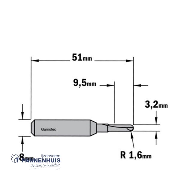 CMT Bolle radiusfrees HWM D=3,2 x 9.5mm R=1,6 L=50,8 S=8 Z2