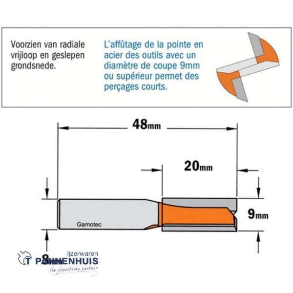 CMT Groeffrees met rechte snijkoppen, HW D=9 x 20mm L=48 S=8 Z2