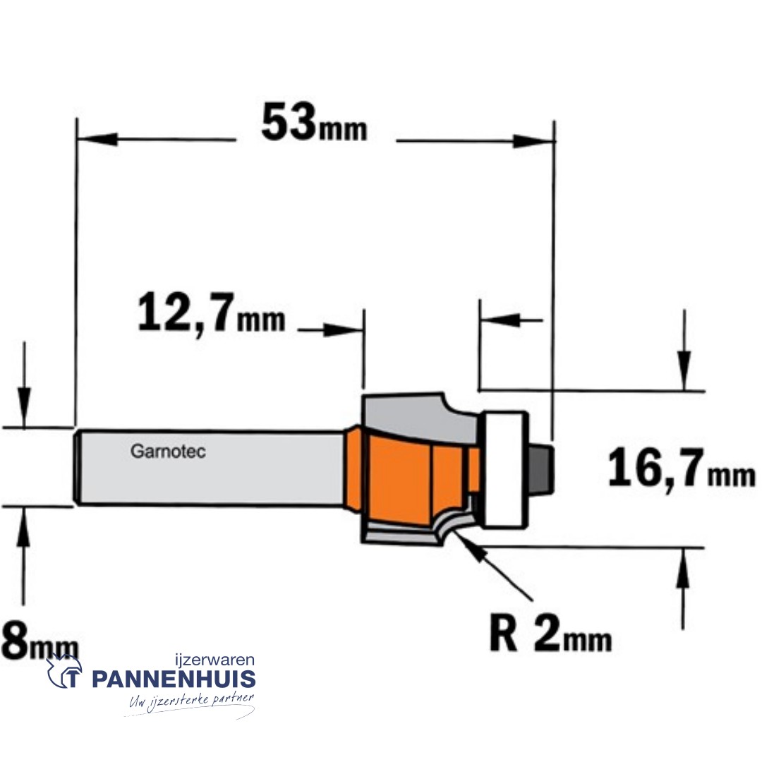 CMT Holle radiusfrees zonder opstaande kant, HW D=16,7 x 12.7mm R=2 L=52,5 S=8 Z2