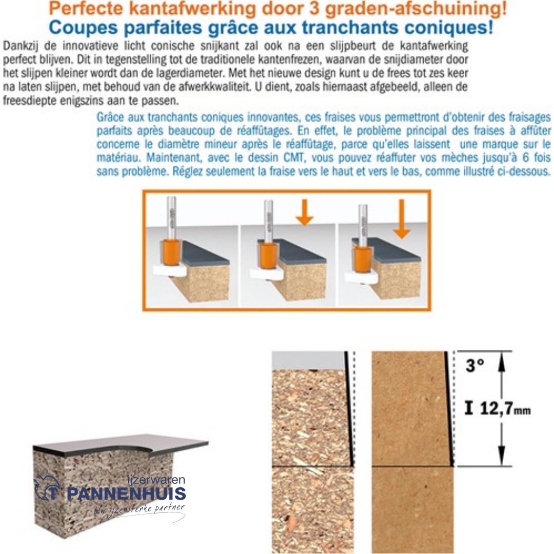 Dankzij de innovatieve licht conische snijkant zal ook na een slijpbeurt de kantafwerking perfect blijven. Dit in tegenstelling tot de traditionele kantenfrezen, waarvan de snijdiameter door het slijpen kleiner wordt dan de lagerdiameter. Met het nieuwe design kunt u de frees tot zes keer na laten slijpen, met behoud van de afwerkkwaliteit. U dient, zoals hierboven afgebeeld, alleen de freesdiepte enigszins aan te passen.