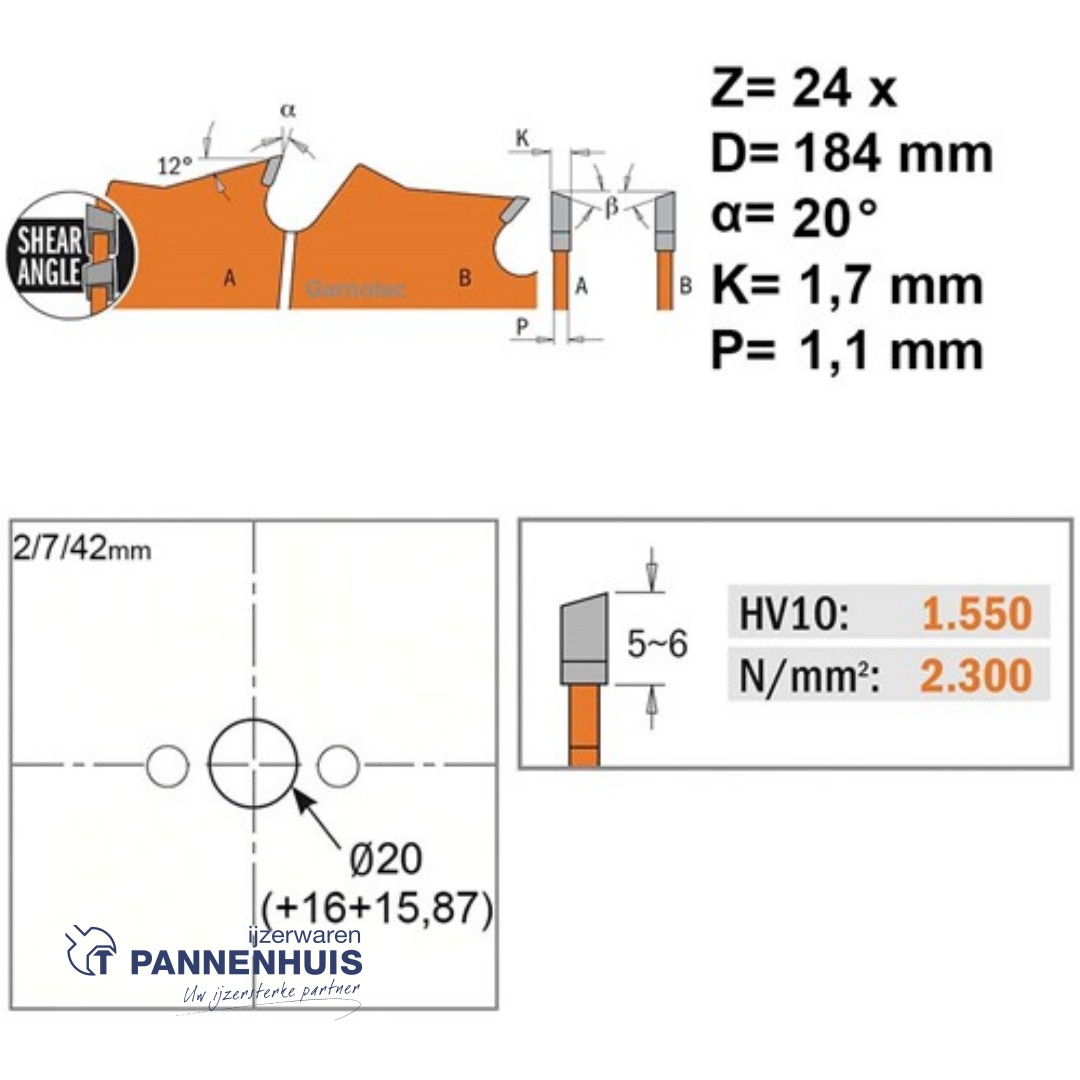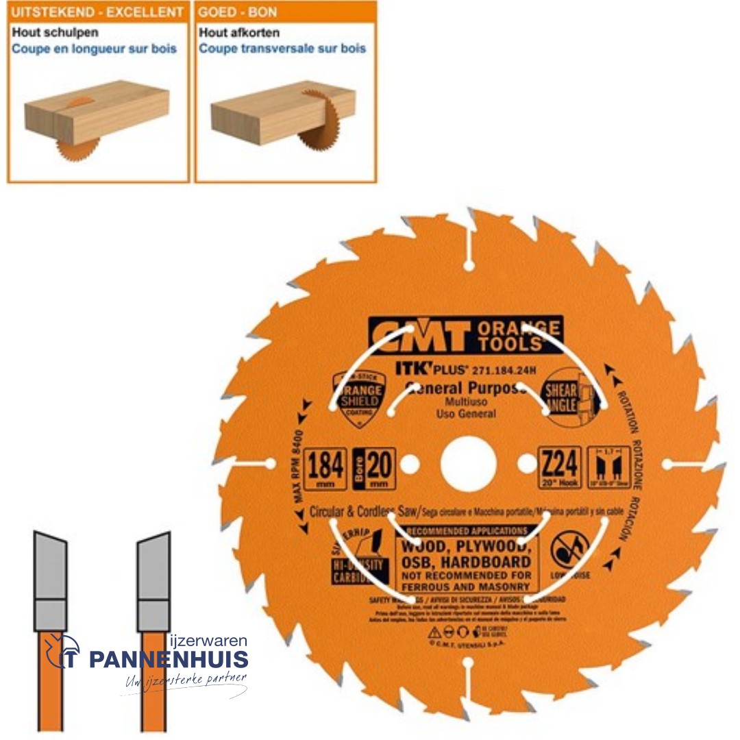 CMT Schulpcirkelzaag HW 184×20(+16 +15,87)x1,7 Z24 Massieve houtsoorten, Multiplex
