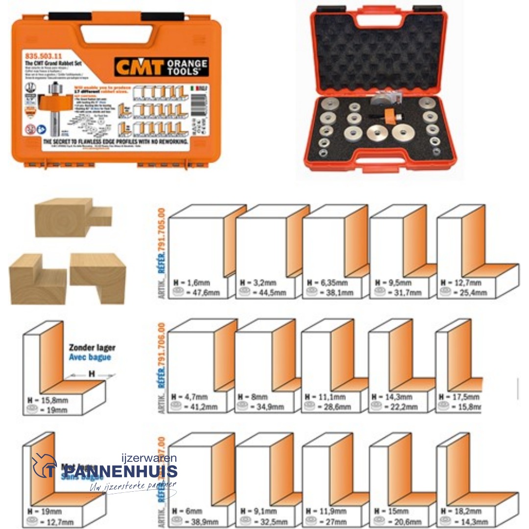 De meest uitgebreide sponningfreesset voor jarenlang freesplezier. Deze prachtige set is samengesteld voor houtbewerkers die gesteld zijn op luxe en alleen genoegen nemen met het beste. De complete set stelt u in staat maar liefst 17 verschillende sponningafmetingen te maken. Verpakt in een fraaie en stevige oranje kunststof koffer.