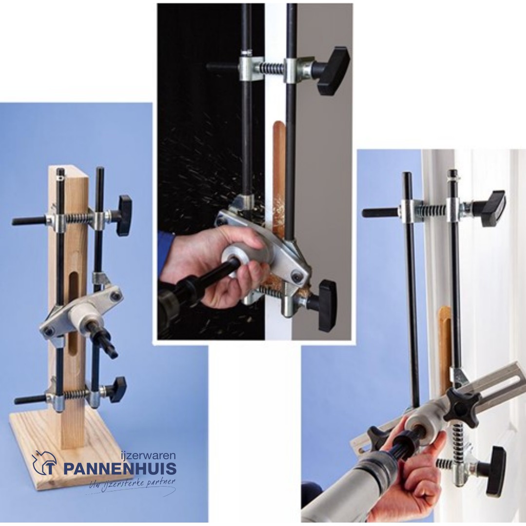 Deze zeer precieze boormal is speciaal ontworpen om de freeskop te begeleiden voor het frezen van slotgaten en ook de voorplaat van het slot. U kunt deze mal snel en eenvoudig op een deur of op een werkstuk plaatsen met een dikte van 30-85mm dik. De CMTJIG1 zal zichzelf centreren bij het vastklemmen.