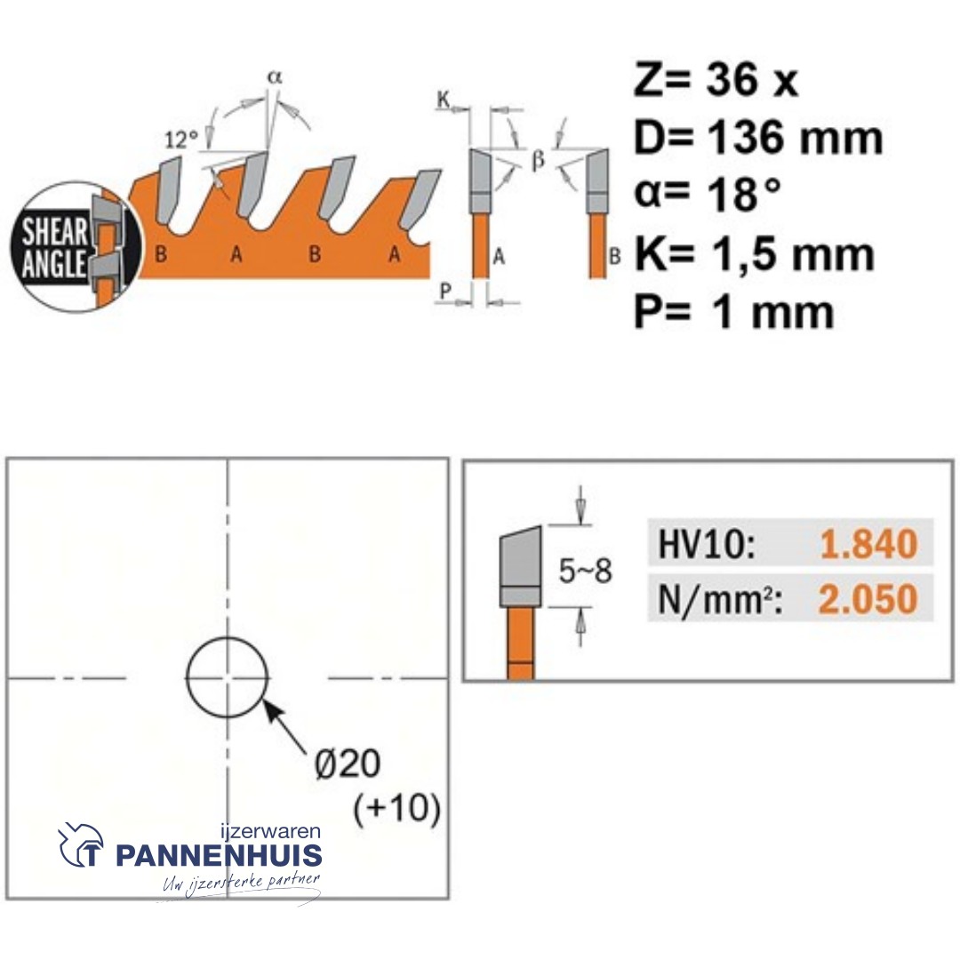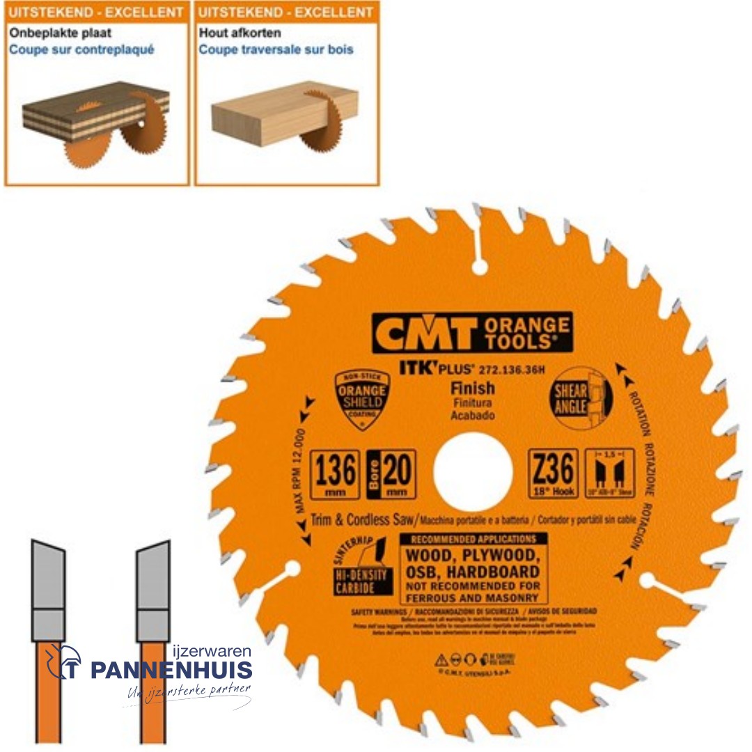 CMT Universele cirkelzaag HW 136×20(+10)x1,5 Z36 Massieve houtsoorten, Multiplex