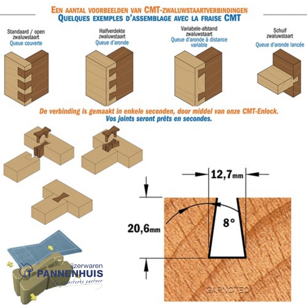 Voor het maken van verbindingen adviseren we het gebruik van het CMT universele verbindingssysteem type CMT300, waarmee alle soorten zwaluwstaartverbindingen en diverse tandverbindingen eenvoudig te maken zijn.