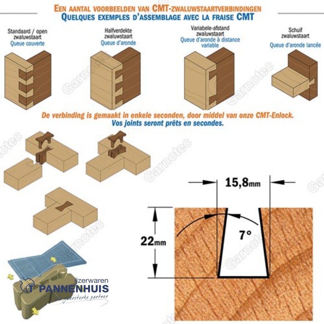 Voor het maken van verbindingen adviseren we het gebruik van het CMT universele verbindingssysteem type CMT300, waarmee alle soorten zwaluwstaartverbindingen en diverse tandverbindingen eenvoudig te maken zijn.