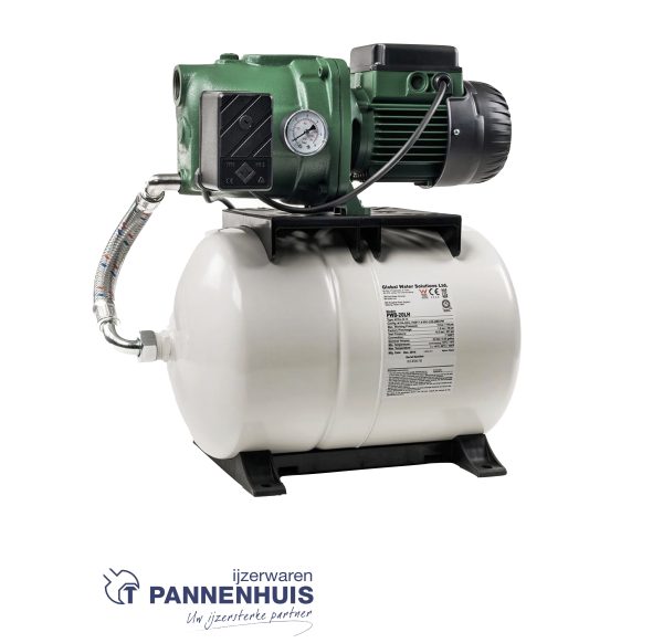 Bestaande uit een zelfaanzuigende elektrische pomp van het type JET , membraanvat van 20 liter, drukschakelaar voor automatische bediening, manometer, compleet met voedingskabel en stekker, alles gemonteerd en klaar voor installatie.