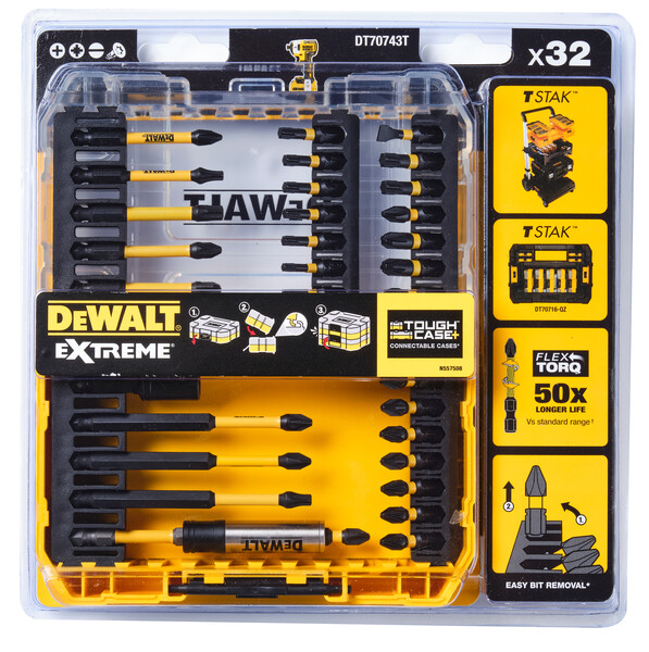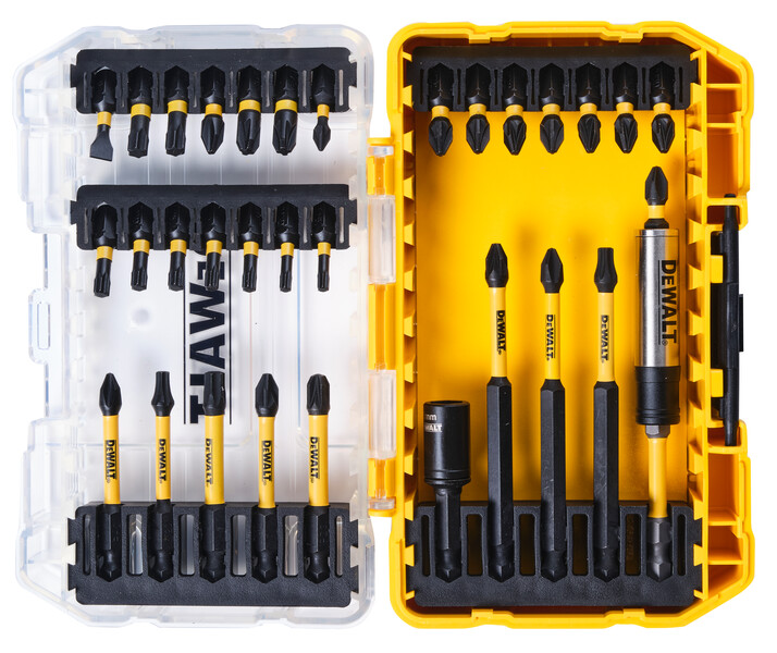 Compatibel met TSTAK, zodat u al uw accessoiresets op één plek kunt bewaren. Compatibel met het TSTAK-systeem via de Caddy en de Large Tough Case. Bits kunnen eenvoudig worden verwijderd en vastgehouden voor optimaal gebruiksgemak. Bits worden vergrendeld zodat ze niet uitvallen wanneer u ze niet gebruikt. Extreme Impact Ready. Geoptimaliseerde puntgeometrie voor een volledige pasvorm in de bevestiging en minder cam-out. Volledig passende kop voorkomt speling en afronding van de schroefkop. Geoptimaliseerde CNC-gefreesde torsiezone voor een sterkere bit en een langere levensduur. Geoptimaliseerde torsiezone maximaliseert de levensduur van de bit en de draaikracht, zelfs in de meest veeleisende toepassingen. Het gevormde gedeelte van de bit beweegt mee met het koppel van de slagschroevendraaier om koppelpieken te absorberen en de bit te beschermen voor een langere levensduur. DEWALT-merktorsiezone. Inclusief bithouder voor torsiezone voor gebruik met 25 mm schroevendraaierbits. Langere levensduur van 25 mm bits bij gebruik in een bithouder voor torsiezone. Inclusief reinigbare moersleutel.