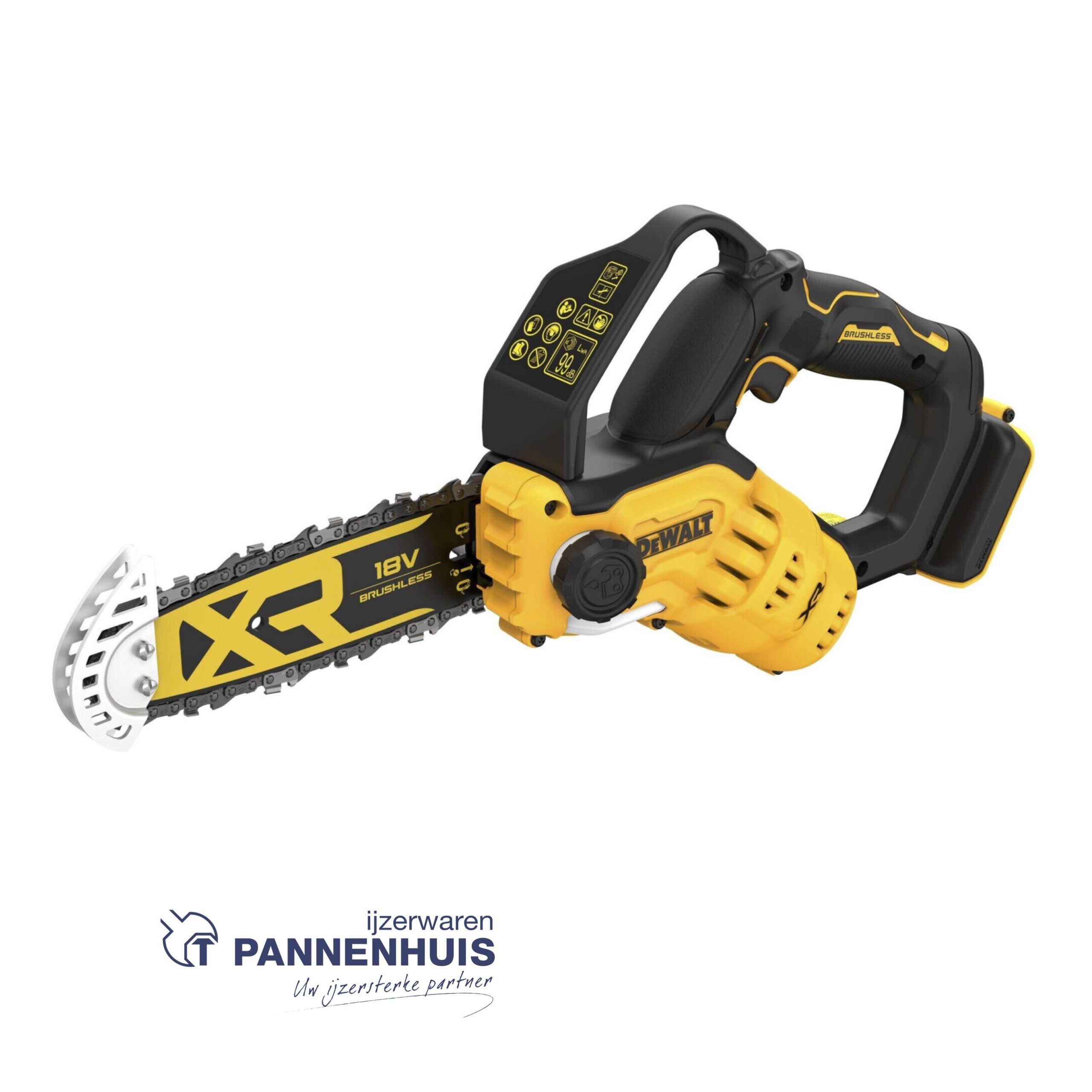 De 18V XR draadloze snoeikettingzaag is licht en compact en heeft een uiterst efficiënte borstelloze motor die is ontworpen om de looptijd en levensduur van de motor te maximaliseren, met maximaal 70 zaagsneden per acculading.