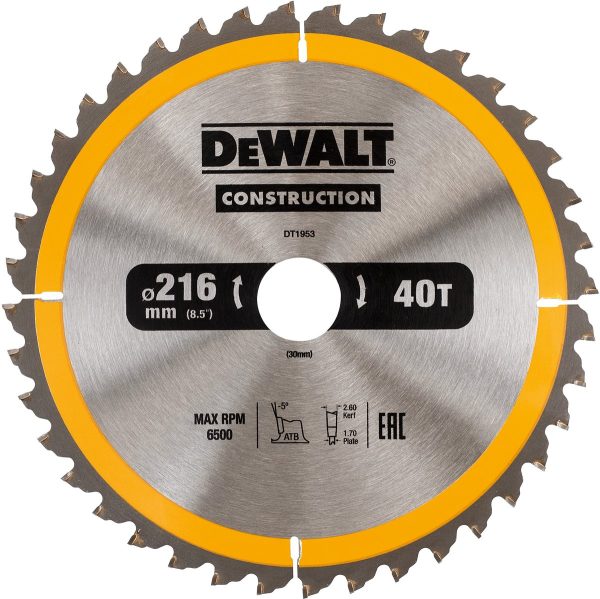 Dewalt DT1953 Construction Cirkelzaagblad – 216 x 30 x 40T – Hout (Met nagels) kenmerken:
