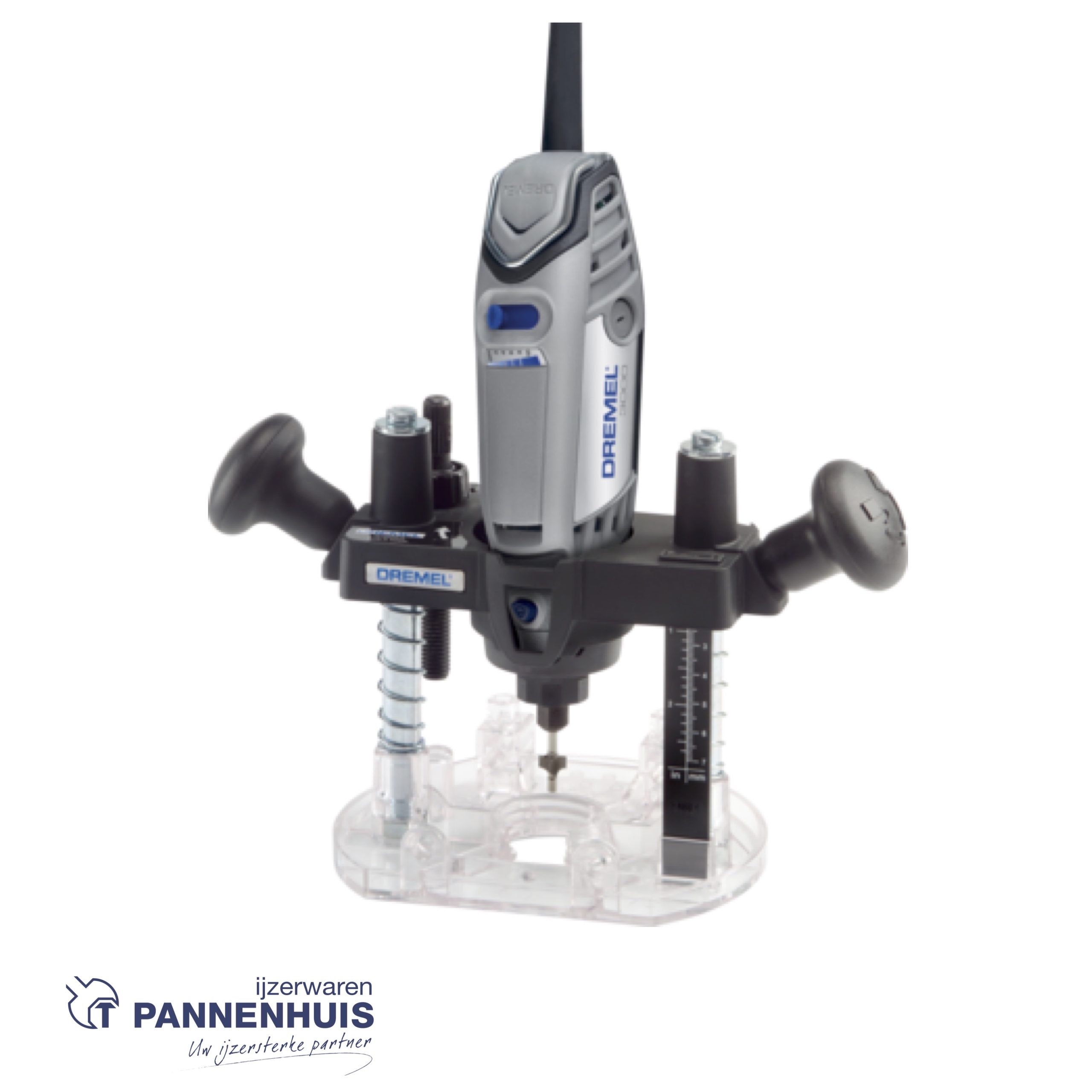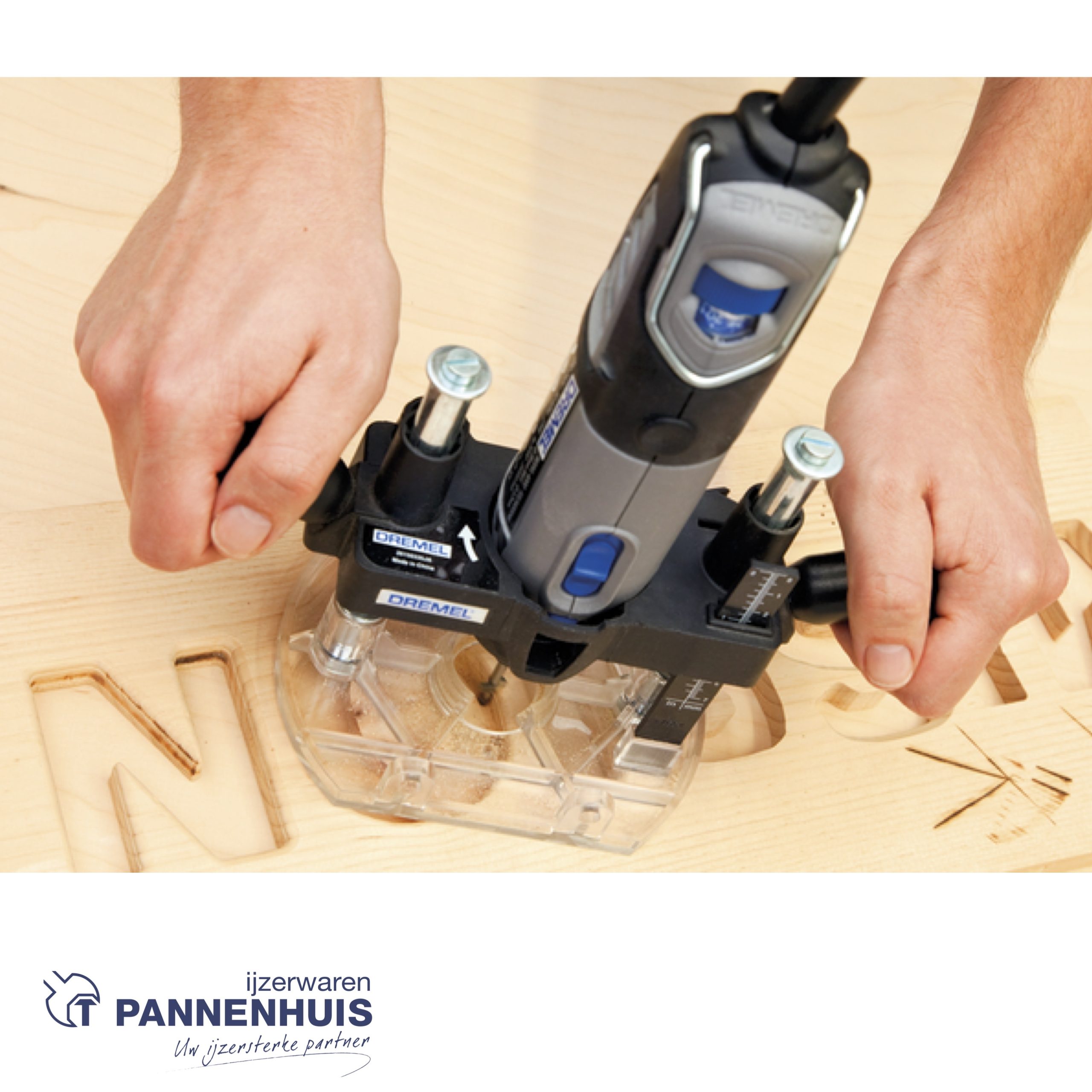 Verandert uw Dremel gereedschap in een profielbovenfrees voor het frezen van cirkels, uithangborden en inlegwerk, decoratieve randen en voor parallel langs een rand frezen.