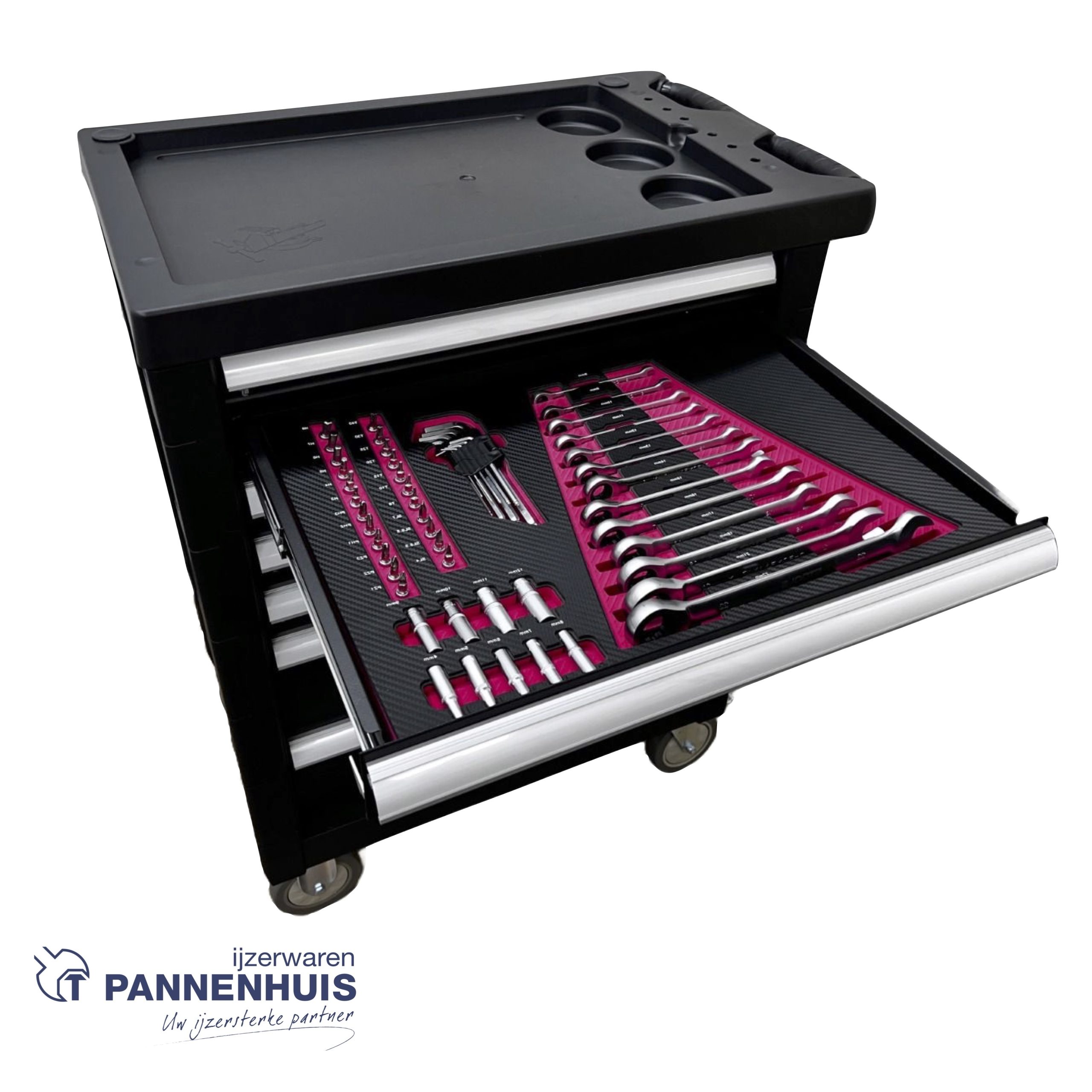 Gereedschapswagen met zeven laden, waarvan vier laden gevuld zijn.