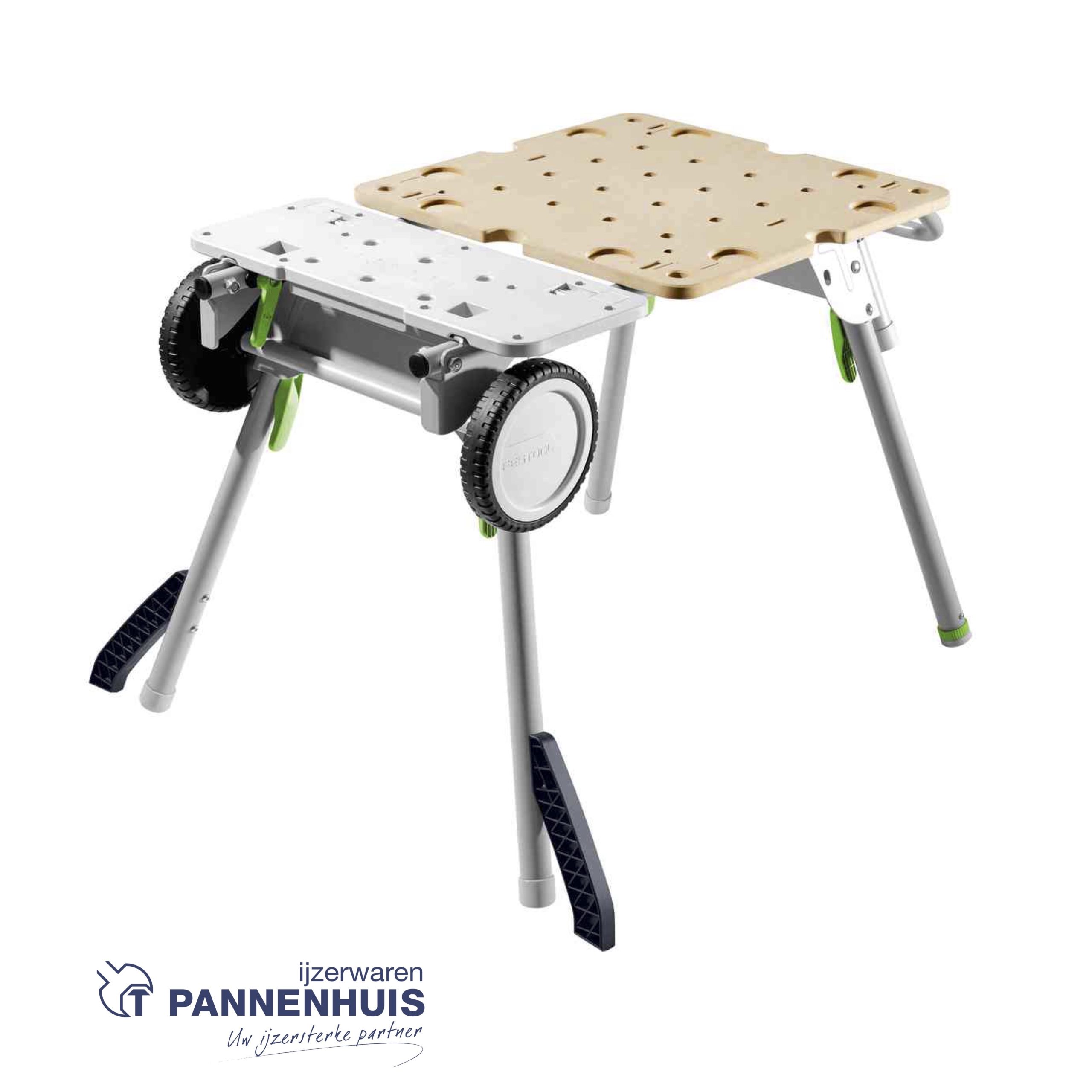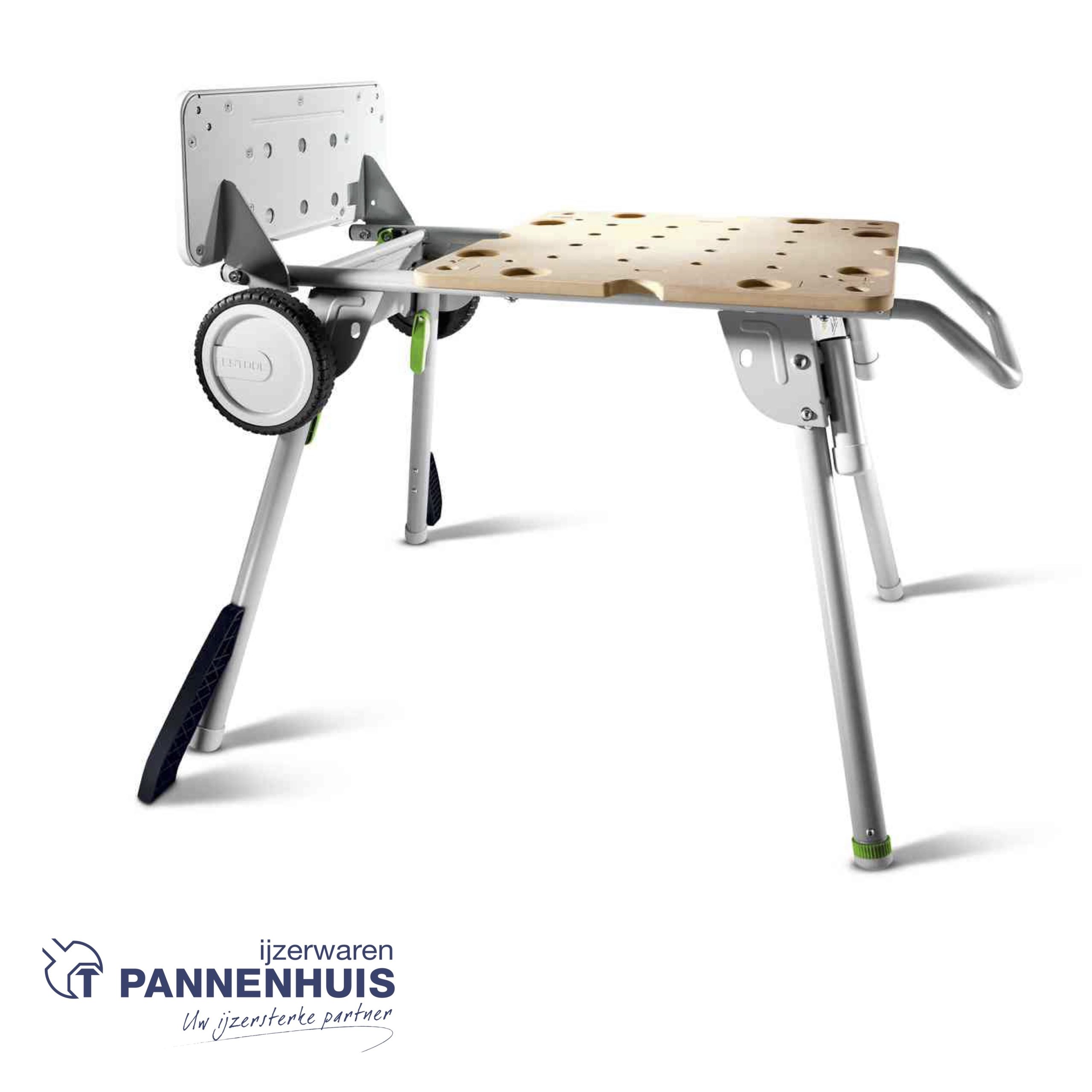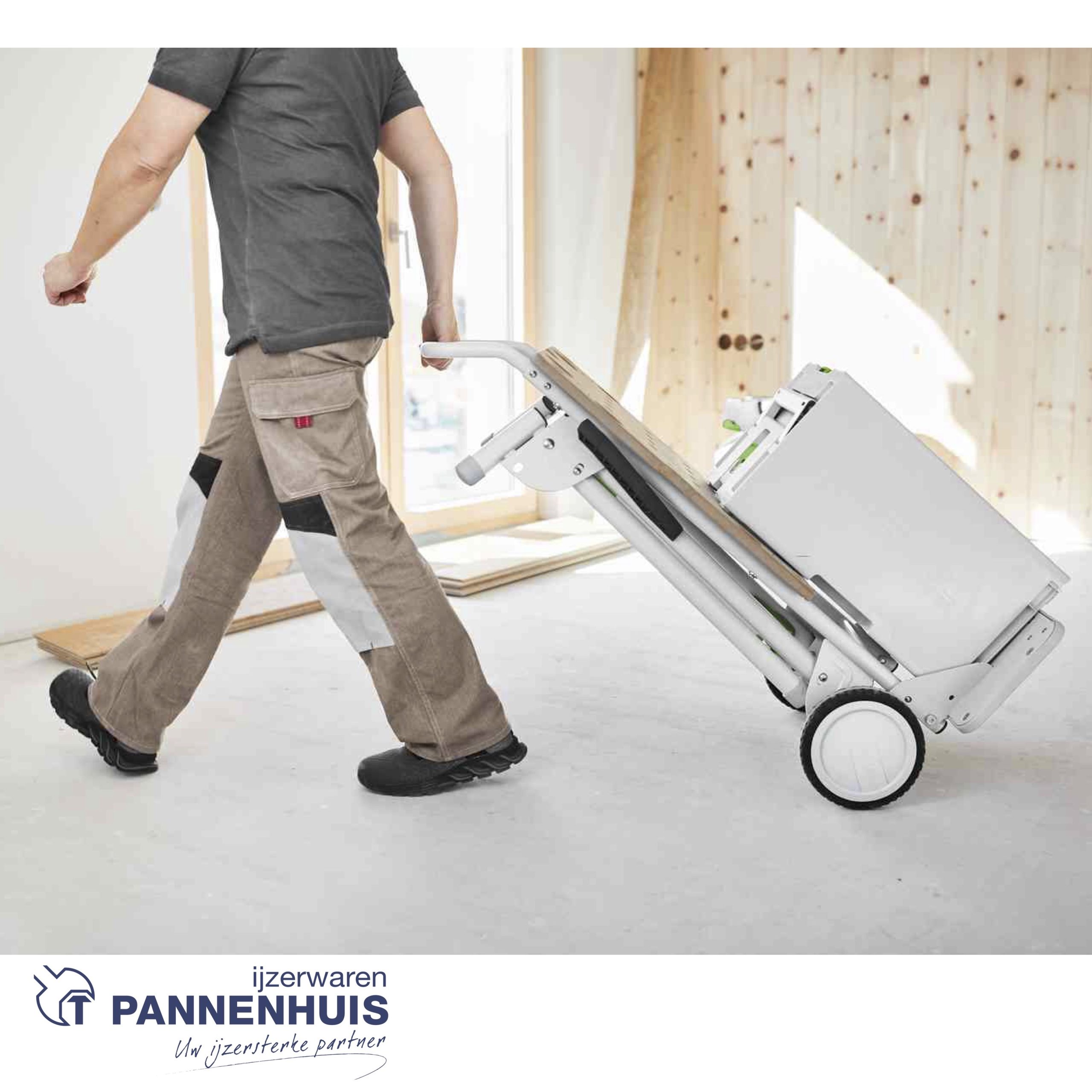 Het onderstel UG-CSC-SYS is de ideale 3-in-1 oplossing voor uw montageklussen. Voor het transport van het voertuig naar de plaats van gebruik dient het onderstel als steekwagen. U kunt een hele toren van Systainers tot 80 kg op die manier met gemak naar de bouwplaats rollen. In een handomdraai zijn de klappoten uitgeklapt en heeft u een werktafel van 58 x 58 cm grootte; een praktisch alternatief voor schragen. Via de vervangingsplaat met gaten worden werkstukken veilig op het vlak gespannen. Het onderstel komt volledig tot zijn recht in combinatie met de accu-tafelcirkelzaag CSC SYS 50. Het onderstel wordt in de gaten van het werkvlak veilig gepositioneerd en u kunt meteen op een ergonomische hoogte van 90 cm werken. Voor het gebruik van de accu-tafelcirkelzaag CSC SYS 50 dichtbij de vloer, bijv. het leggen van vloeren, blijven de poten gewoon ingeklapt. Het “blad” dat net nog als transportvlak voor de Systainers diende, wordt nu opgesteld als een ideale steun voor lange werkstukken bij alle lengte-, dwars- en hoekzaagsnedes.