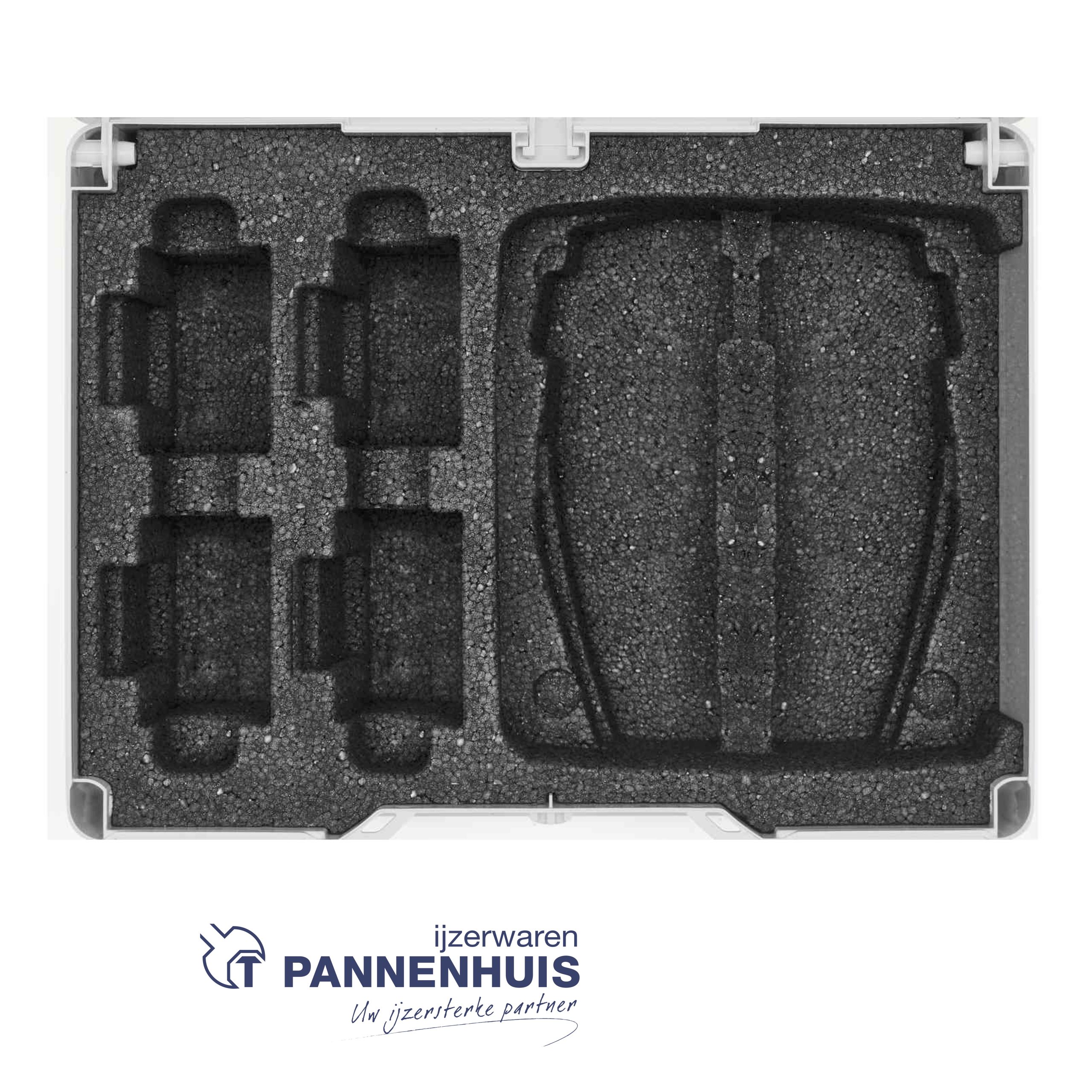 Super flexibel: om het even of u nu de grote accu-packs (6,2 Ah/ 5,2 Ah), de kleine, compacte 4,0 Ah of 3,1 Ah accu-packs gebruikt – de slimme inleg overtuigt met flexibiliteit voor accu-packs en oplaadapparaten (TCL 6 en SCA 8)
