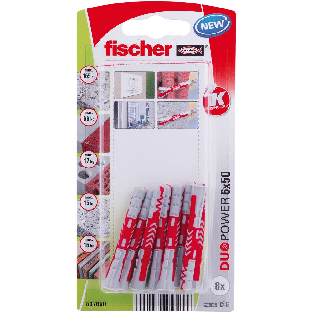 De fischer DuoPower is een slimme 2-componenten plug met drie verschillende werkingsprincipes. De slimme universele plug is geschikt voor bevestigingen in alle bouwmaterialen. Hierdoor ontstaan velerlei soorten toepassingen met slechts één plug. De fischer DuoPower past zich zelfstandig aan het bouwmateriaal aan verdeelt door de drie werkingsprincipes spreiden, tikken en knopen de zwaarste lasten over het bouwmateriaal. De uitermate goede reactie bij het indraaien van de schroef zorgt voor extra veiligheid. De fischer DuoPower 6 x 50, 8 x 65 en 10 x 80 zijn door de grotere verankeringsdiepte bijzonder geschikt voor bevestigingen in geperforeerd bouwmateriaal, cellenbeton en voor het overbruggen van pleisterlagen.