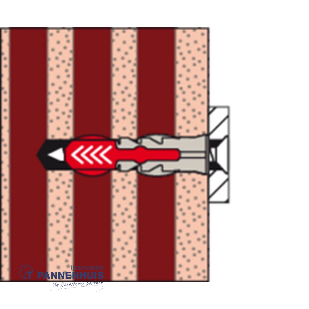 Door de grotere verankeringsdiepte van de DuoPower 6 x 50, 8 x 65 en 10 x 80 zijn de pluggen bijzonder geschikt voor bevestigingen in geperforeerd bouwmateriaal, cellenbeton en voor het overbruggen van pleisterlagen.
