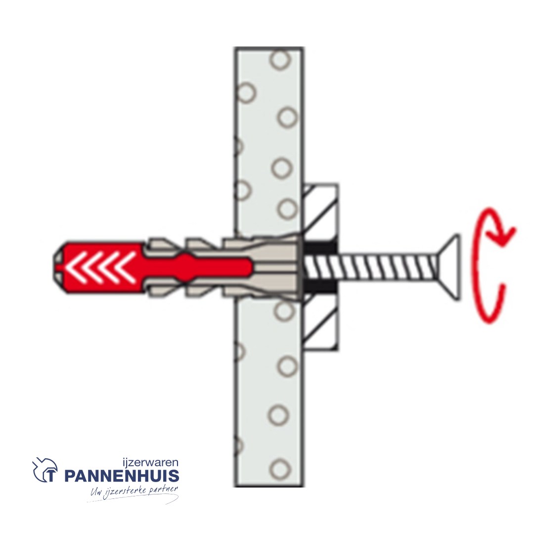De fischer DuoPower heeft een zeer hoge bevestigingswaarde door de 2 componenten: De grijze component van kwalitatief hoogwaardig nylon activeert, afhankelijk van het bouwmateriaal, automatische het optimale werkingsprincipe (spreiden, tikken, knopen) voor het optimaal houvast. De expansievleugels van de rode component ondersteunen de betrouwbare spreiding en biedt extra veiligheid voor de grijze component. De schroef gewoon indraaien en tot slot goed aantrekken. De schroef niet de vast aandraaien. De bij de kop aangebrachte rand voorkomt, dat de plug in het boorgat glijdt. De meegeleverde schroeven zijn exact op de fischer spreidplug DuoPower afgestemd.