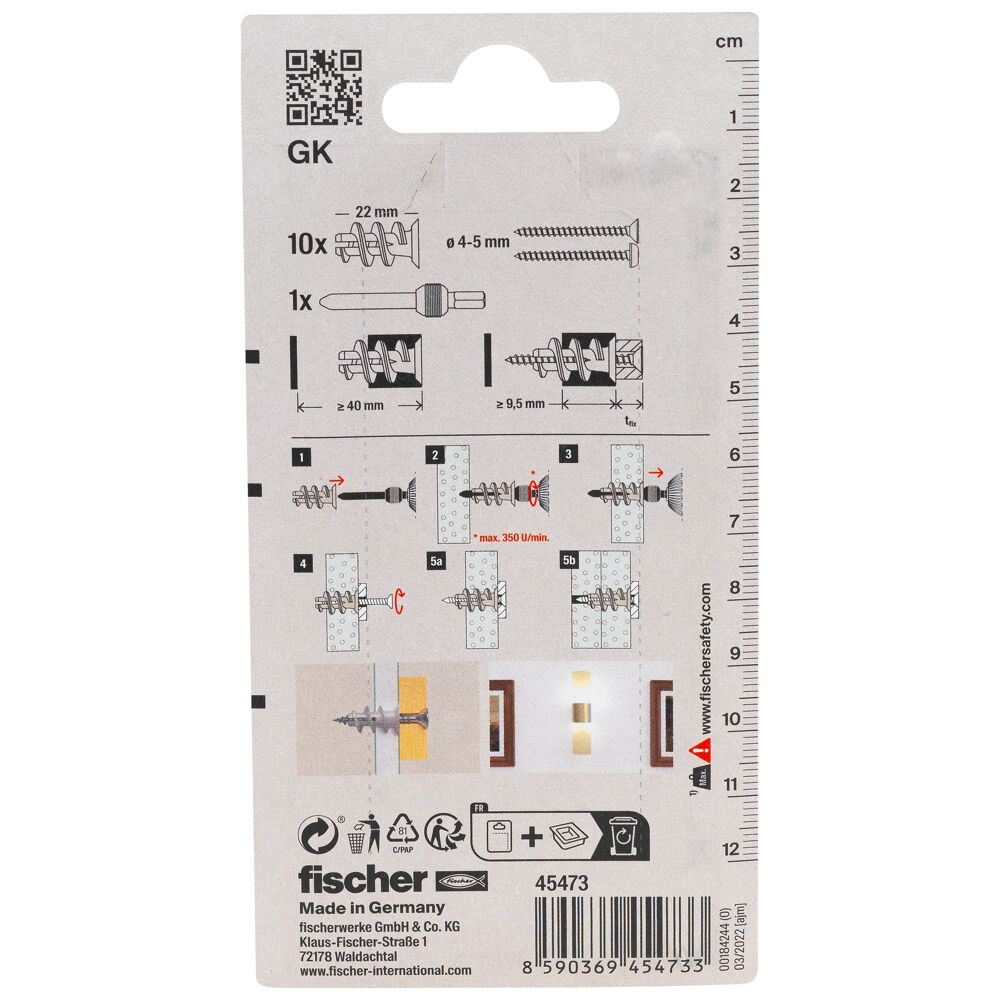 De fischer Gipsplaatplug GK wordt gemaakt van kwalitatief hoogwaardig nylon. De plug wordt in de voorsteekmontage met het bijgevoegde montagehulpstuk en een accuschroevendraaier lijnend met het oppervlak in de gipsplaten gedraaid. Tot een plaatdikte van 15 mm hoeft niet voorgeboord te worden. De fischer GK kan hout-, plaat- en spaanplaatschroeven van 4 tot 5 mm dik, evenals diverse haken en ogen opnemen. Daarmee is hij universeel geschikt om schilderijen, lampen en elektrische installatie betrouwbaar en snel te bevestigen.
