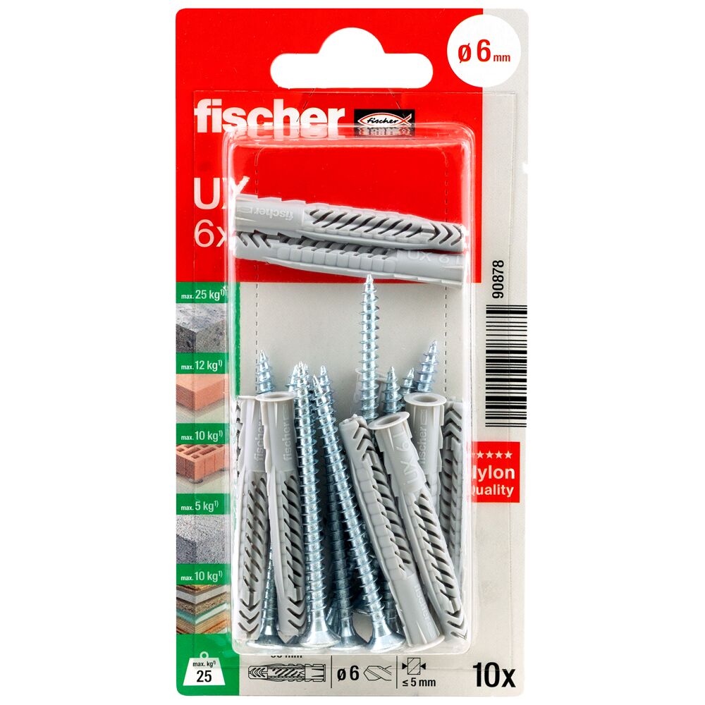 De fischer Universele plug UX is een allrounder van kwalitatief hoogwaardig nylon. De plug houdt in beton, maar ook in cellenbeton, metselwerk en gipskarton- of gipsvezelplaten. In deze materialen vormt de plug een knoop. Handig daarbij is de voorgevormde rand. Daardoor glijdt de plug bij het insteken niet in het boorgat. In de verpakking worden de schroeven met de juiste diameter en de juiste lengte al meegeleverd. Zo hoeft u nooit te zoeken en weet u zeker dat de schroef perfect bij de plug past. Met de fischer Universele plug UX kunnen bijvoorbeeld buisleidingen in combinatie met buisklemmen worden bevestigd.