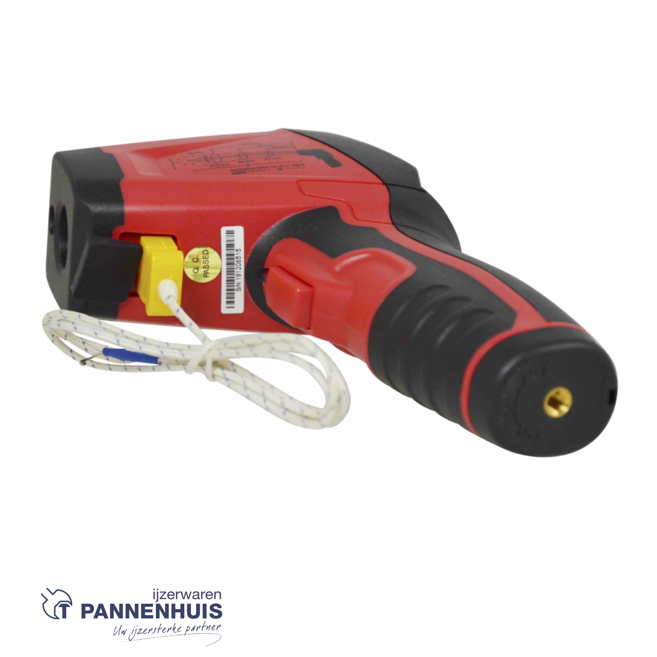 Infrarood thermometer om contactloos de temperatuur van (gevaarlijke, bewegende) oppervlaktes te meten tussen -50°C en +800°C met een nauwkeurigheid van 1%. 9 laserstralen wijzen het centrum van het meetgebied aan.