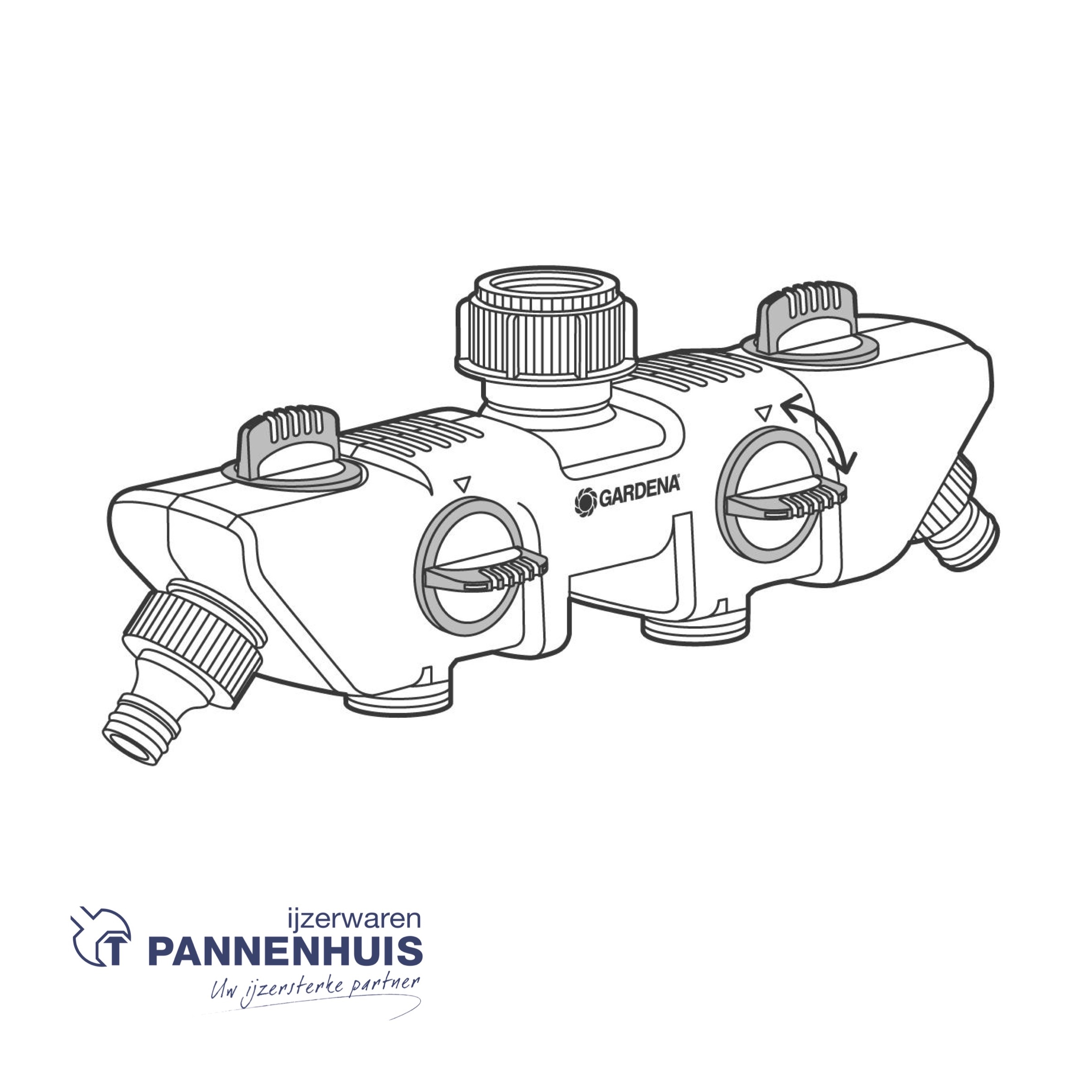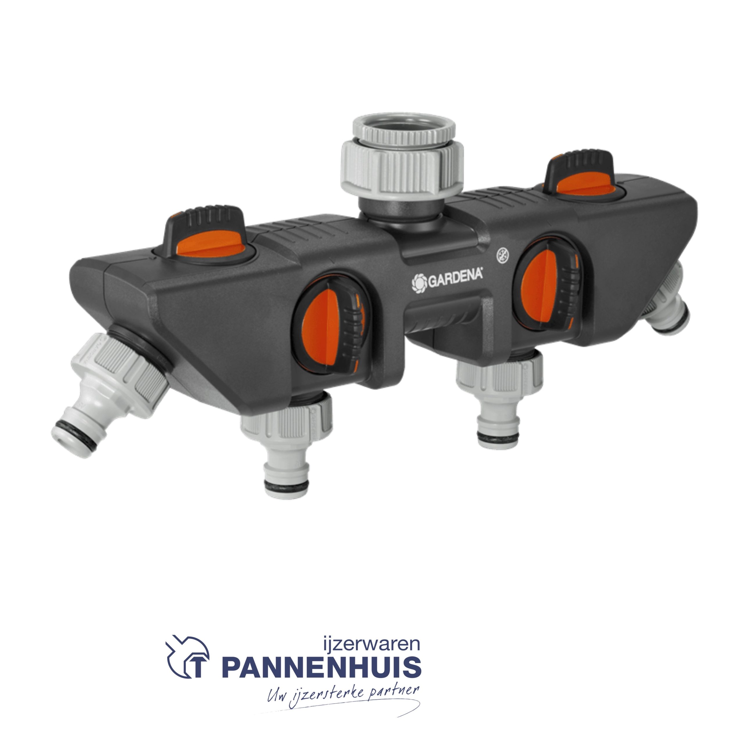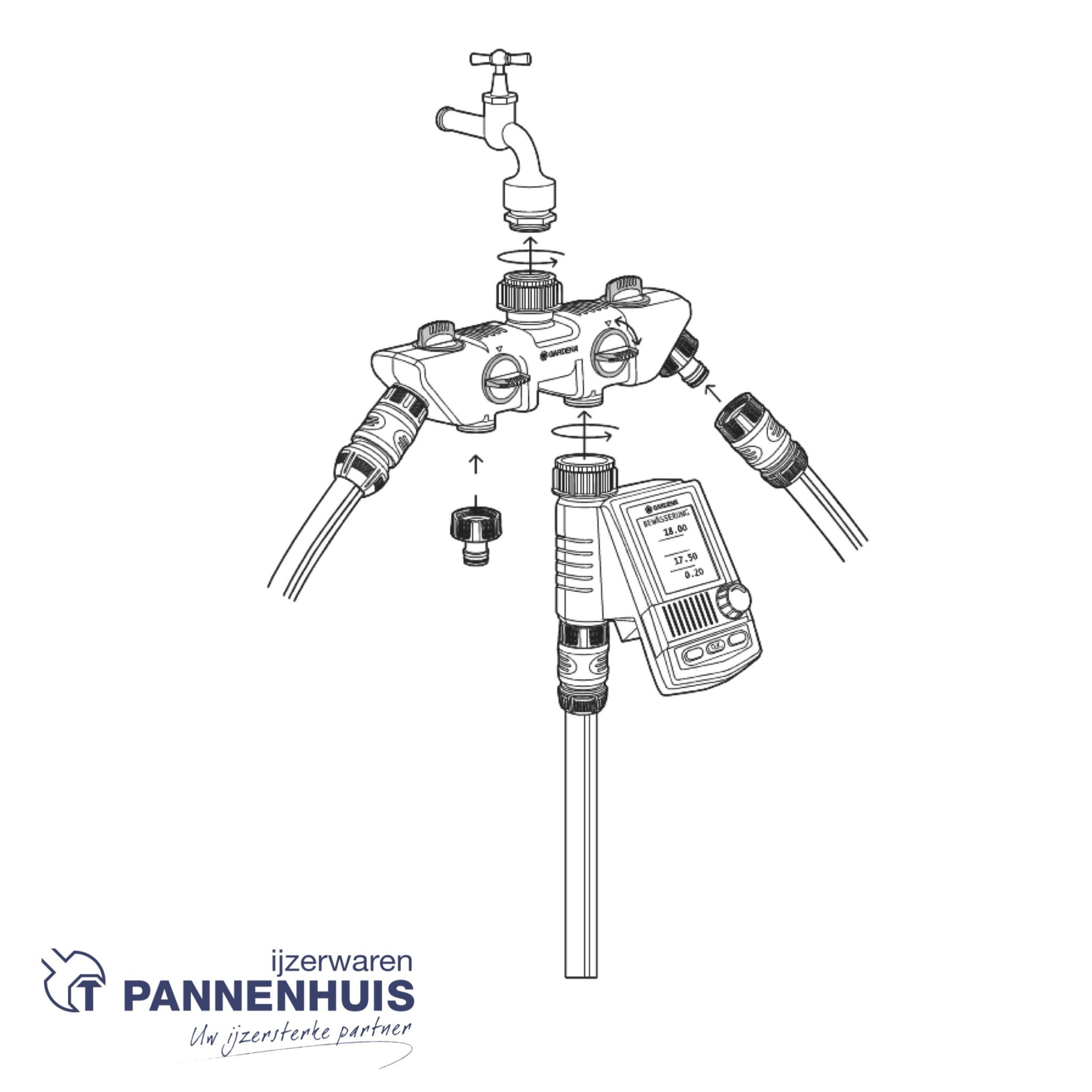 Op de 4-weg waterverdeler kunnen twee GARDENA besproeiingscomputers of watertimers worden aangesloten.