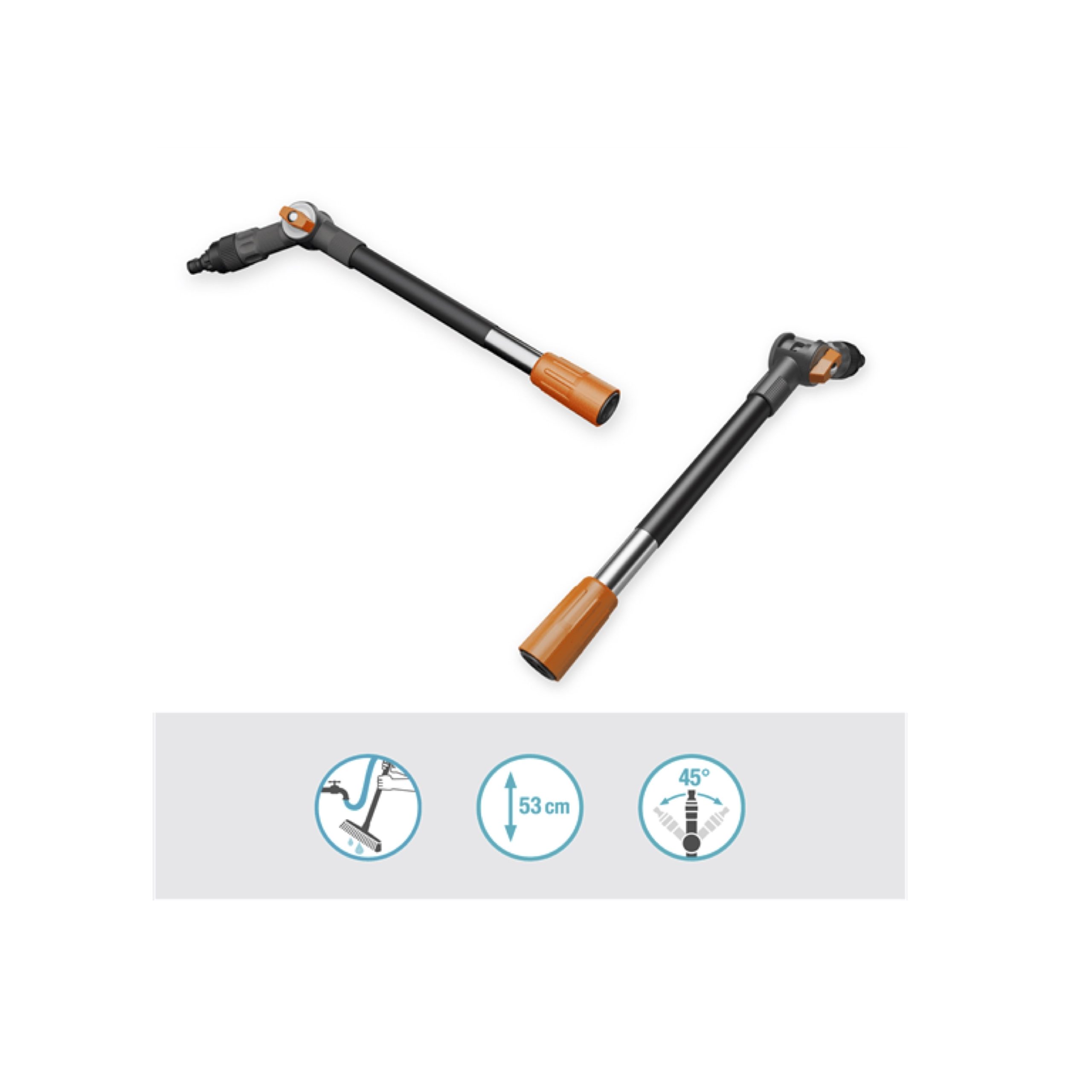 Heel gemakkelijk: De steel sluit je eenvoudig aan op de tuinslang om moeilijk bereikbare plekken schoon te maken