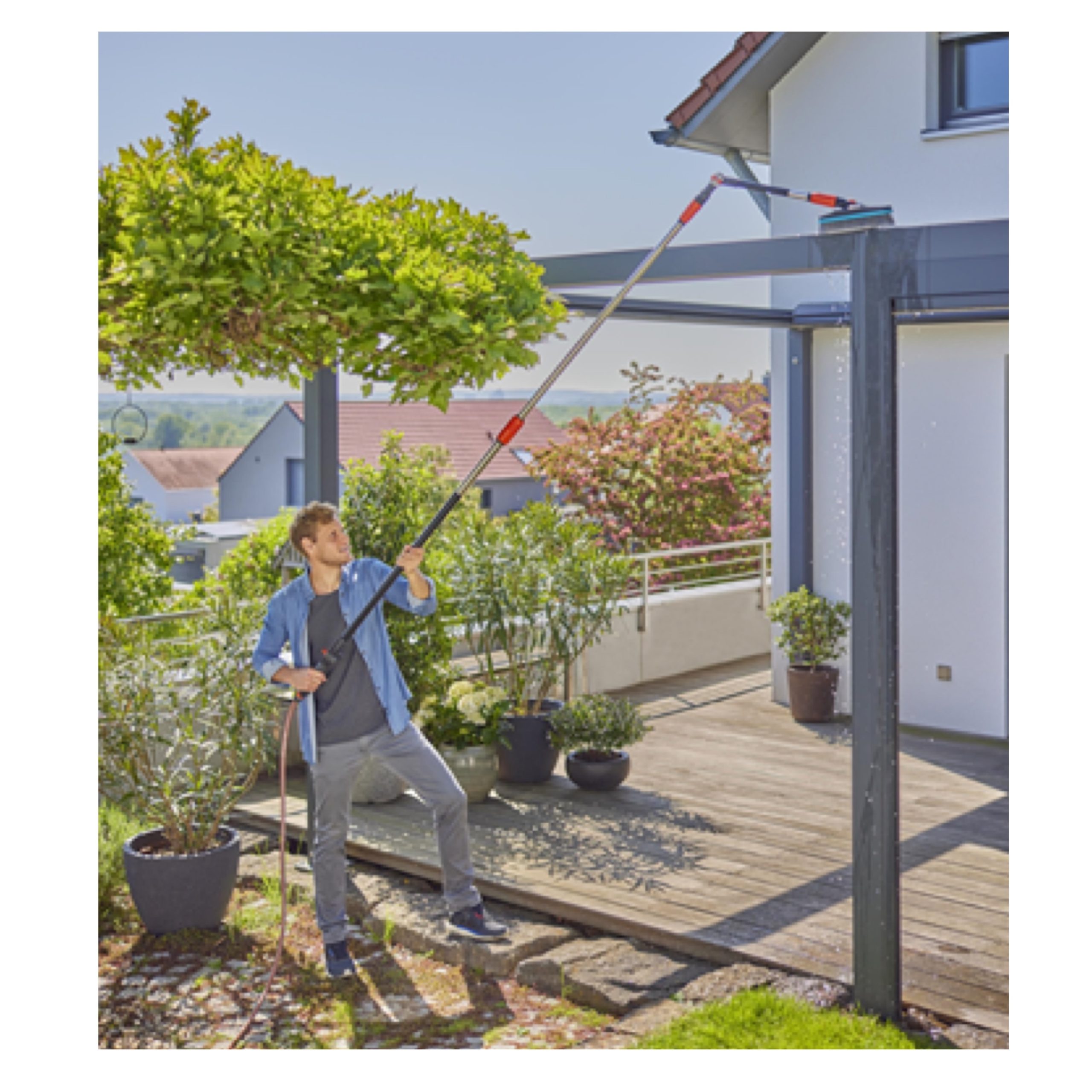 De GARDENA Cleansystem steel Flex is ideaal voor de natte reiniging van ontoegankelijke plekken zoals terrassenoverkappingen.