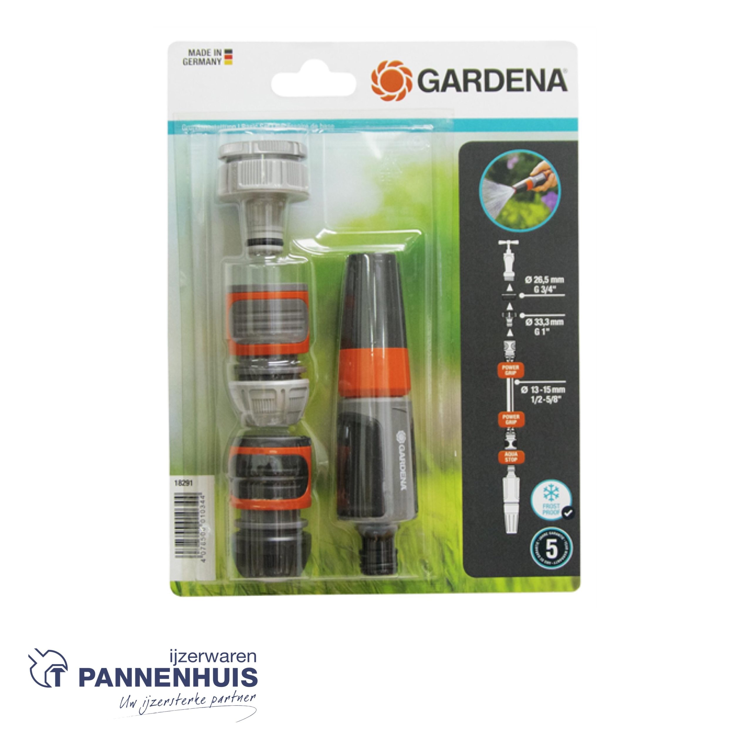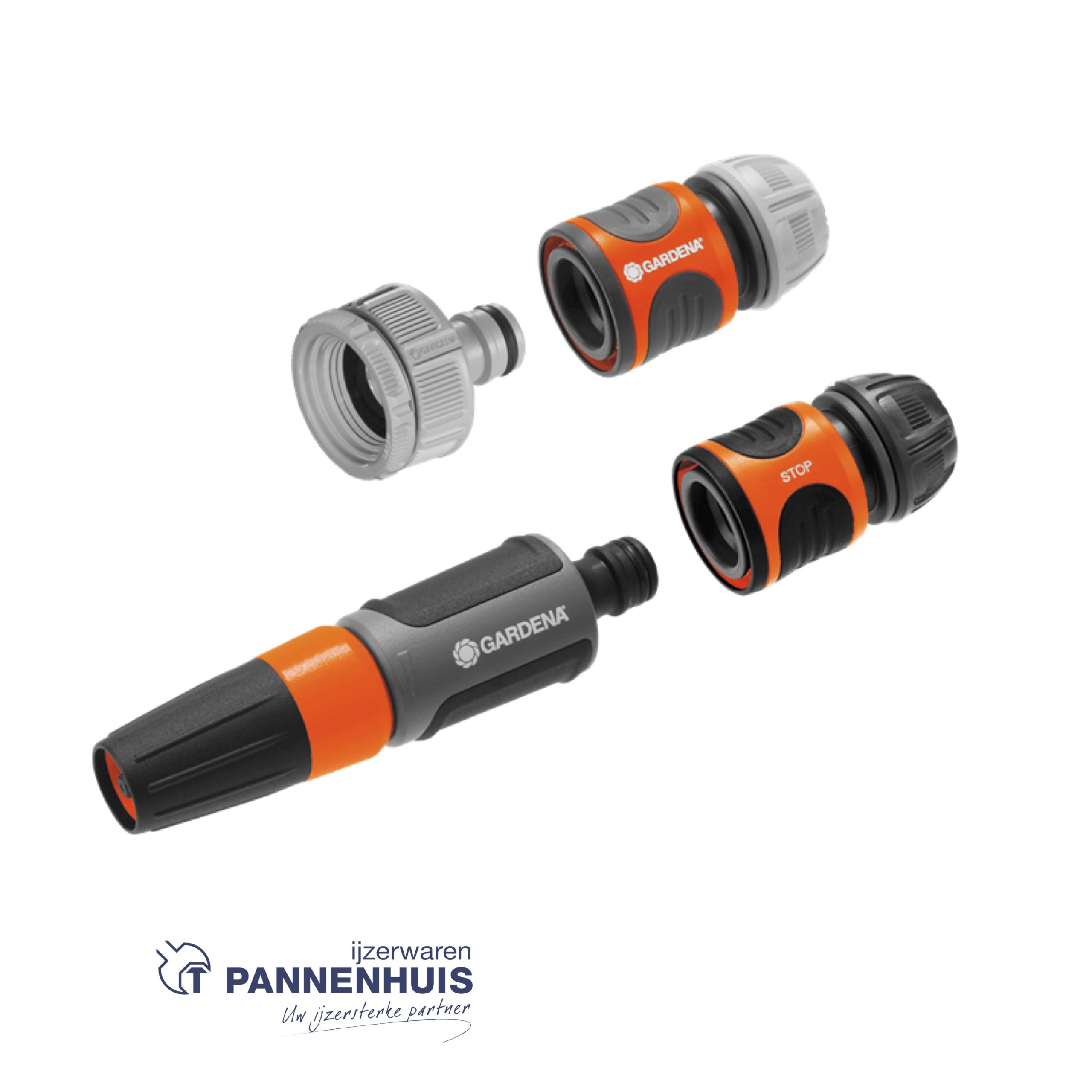 De GARDENA basisset bevat een kraanstuk met adapter (art.nr. 18202 en 5305), een slangstuk (art.nr. 18215), een aquastop (art.nr. 18213) en een Classic tuinspuit (art.nr. 18300).
