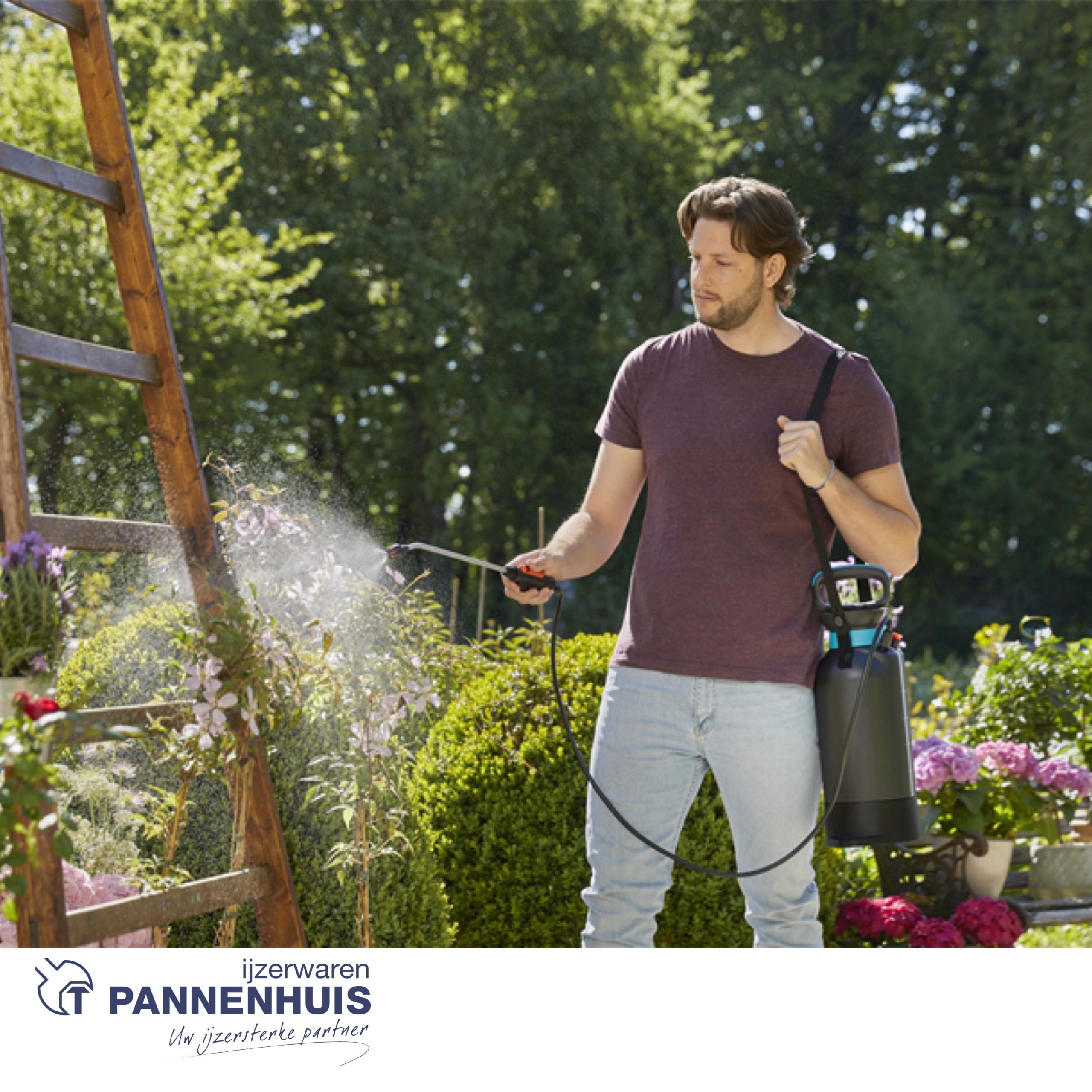 Met de drukspuit 5 l Comfort van GARDENA bent u goed uitgerust voor diverse plantverzorgingstaken in uw tuin. Gebruik de spuit om uw bloemen, struiken of zelfs bomen nauwkeurig te behandelen, of het nu gaat om sproeiberegening, bemesting of gewasbescherming, chemisch of organisch. Voordat u begint, bouwt u druk op in het reservoir van 5 liter door de handige D-handgreep omhoog en omlaag te pompen. Omdat de spuitfles ook voorzien is van ergonomische schroefdraad in de voet, hebt u tijdens het pompen altijd een stevige standaard. Voor het maken van uw eigen biologische plantenbehandelingen zijn recepten en een bijbehorend nylon filter inbegrepen. Met dit filter kunt u eenvoudig een netelbrouwsel uitzeven en dit vervolgens als sproeimiddel gebruiken tegen ongedierte zoals bladluizen. Het vulproces wordt aanzienlijk eenvoudiger gemaakt door de conische opening van 12 cm. Wanneer alles klaar is voor het sproeien, kunt u de ergonomisch geplaatste schouderband gebruiken om de drukspuit comfortabel te dragen. Op de kijkstrook kunt u zien hoeveel vloeistof er nog in het reservoir zit. De spuitlans past zeer goed in de hand en heeft een vergrendelfunctie, zodat de drukspuit 5 l Comfort ook in dit opzicht zijn naam alle eer aandoet. Met de sproeistraal of de sproeinevel hebt u de keuze uit twee verschillende sproeipatronen om uw planten flexibel te behandelen.