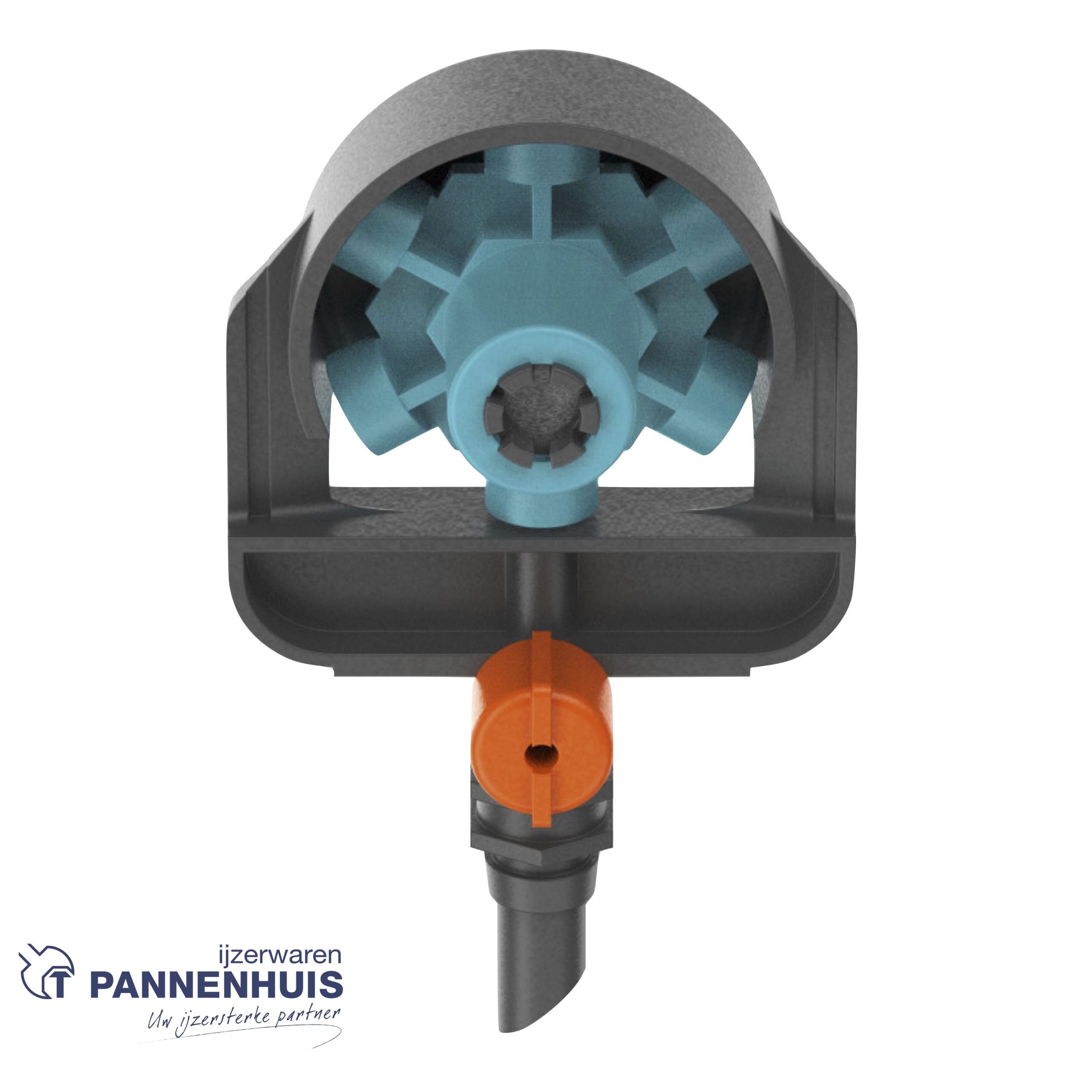 De 6 in 1 Sproeier van GARDENA geeft je alle opties voor flexibele tuinbewatering. Hij combineert de kracht van meerdere sproeiers en met zijn 6 verschillende sproeipatronen kan je hem aanpassen op de behoeften van jouw tuinplanten. De sproeier spuit een fijne nevel en geeft gewassen, bloemen of zaailingen op betrouwbare wijze water. Daarnaast kan je met de verstelbare sproeihoek van 90°, 180°, 270° of 360° de functies van een Micro Strook Sprinkler en Micro Strook Sprinkler Uiteinde gebruiken. Dit maakt het mogelijk om lange, nauwe zones in slechts één of twee richtingen te besproeien. Tot slot kan je de sproeiafstand met de draaiknop verstellen. Het Micro-Drip-System-onderdeel is makkelijk en eenvoudig op de 13 mm Koppelingsbuis aangesloten door gaten te stansen met behulp van het Montagegereedschap of door het T-stuk voor Sproeiers te gebruiken. Met de Verlengbuis voor Sproeiers (art. nr. 13326-20) kan je de positie van de 6 in 1 Sproeier op elk moment verhogen om je tuinplanten van boven te blijven besproeien, zelfs na een groeispurtje. Het Afsluitventiel (art. nr. 13207-20) zorgt dat de waterstroom wordt gereguleerd en dat je afzonderlijke delen van de Koppelingsbuis kan afsluiten. Dit zorgt voor een optimale, waterzuinige bewatering. Je kan het sproeipatroon direct zien op de sproeikop dankzij het intuïtief ontwerp, dat duidelijk alle GARDENA Sproeiers van elkaar onderscheidt. Micro-Drip-System. Zo zorg je goed voor je planten maar bespaar je toch water. Makkelijk en nauwkeurig bewateren, om water en tijd te besparen.