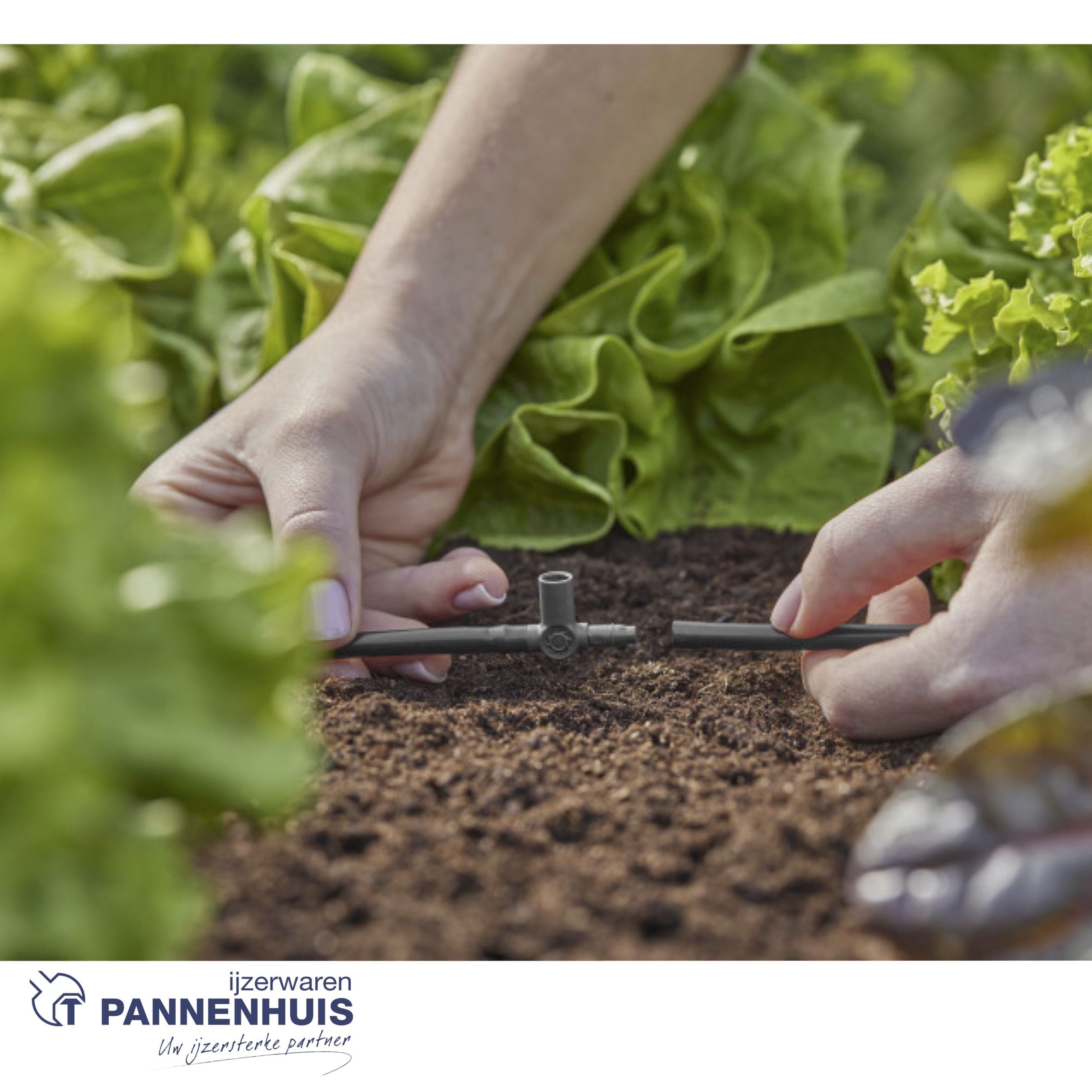 Gebruik het T-stuk voor Sproeiers en Einddruppelaars 4,6 mm (3/16″) van GARDENA om Sproeiers en Einddruppelaars stevig en betrouwbaar te bevestigen aan de 4,6 mm Aanvoerbuis. De 5 inbegrepen T-stukken hebben twee inlaten en uitlaten per stuk voor de Aanvoerbuis en je kan ze stevig inschroeven om een Sproeier te installeren, waardoor je een Einddruppelaar om kan bouwen tot een Seriedruppelaar. Je kan ook een verlengstuk stevig aansluiten om een Sproeier te bevestigen. Hiermee kan je bijvoorbeeld het systeem aanpassen aan je plantbedden, om ze optimaal te bewateren. De slimme koppelingstechnologie maakt snelle installatie en grote aanpasbaarheid mogelijk. Dankzij de Easy & Flexible-koppelingstechnologie kan je de MDS-onderdelen aan elkaar koppelen, verlengen of net zo makkelijk weer ontkoppelen, om de boel weer anders in te delen. Deze herbruikbaarheid van de onderdelen maakt het gehele Micro-Drip-System een duurzaam stelsel. In combinatie met het apart verkrijgbaar Hoofdapparaat 1000 (art. nr. 13333-20) of Hoofdapparaat 2000 (art. nr. 13310-20), is je Micro-Drip-System tuinbewatering betrouwbaar waterdicht, met een gelijkmatige waterdruk. Het T-stuk voor Sproeiers en Einddruppelaars 4,6 mm (3/16″) van GARDENA heeft een indrukwekkende hoge kwaliteit en is gemaakt in Europa. Micro-Drip-System. Zo zorg je goed voor je planten maar bespaar je toch water. Makkelijk en nauwkeurig bewateren, om water en tijd te besparen.