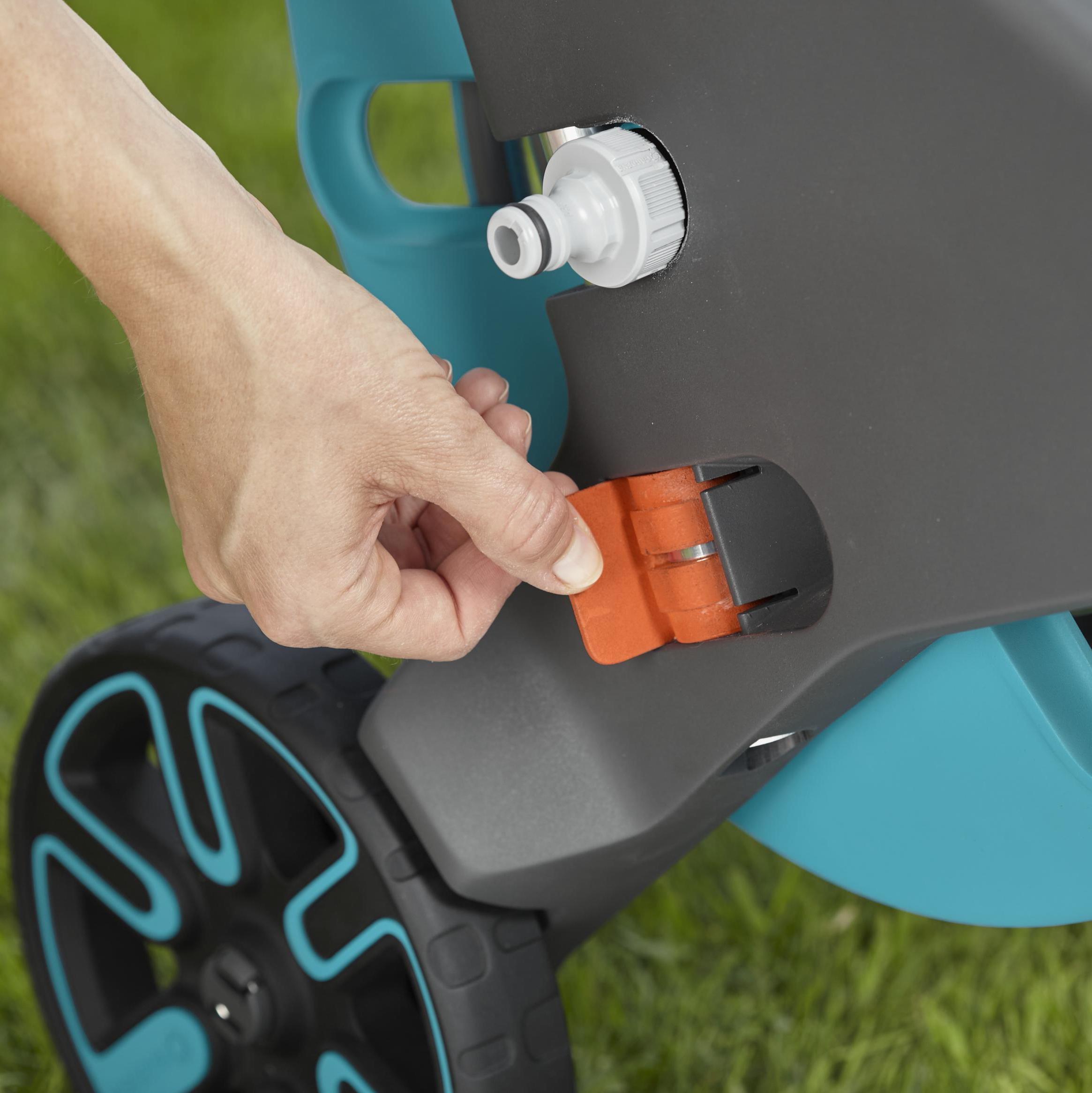 De slang is uitgerust met Original GARDENA System componenten en de tuinspuit hangt aan de praktische vasthoudclip op het bovenframe.