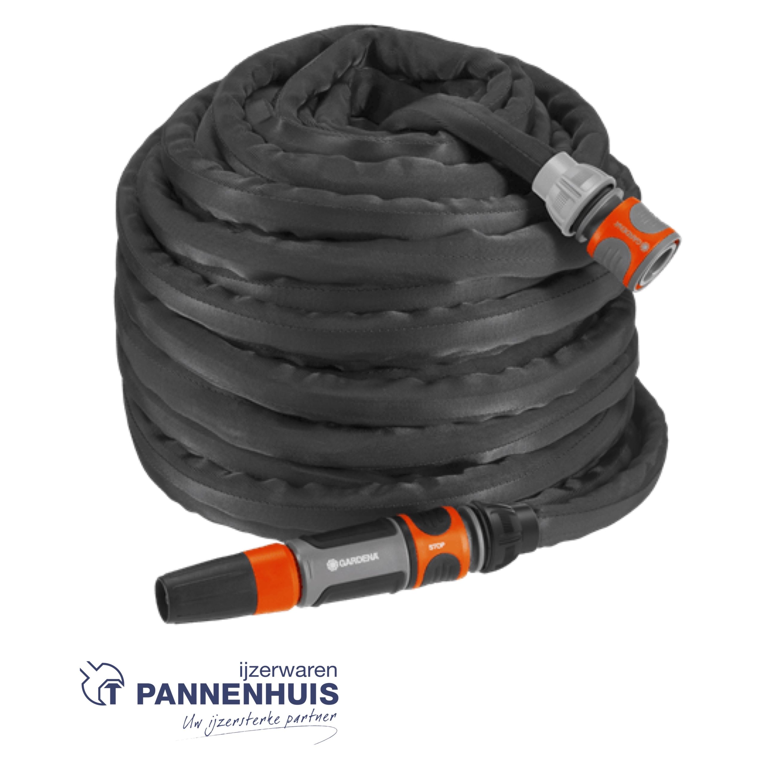 De textielslang Liano Set 30 m wordt compleet geleverd met een schroefkraanaansluiting die geschikt is voor drie verschillende kraanafmetingen, slangaansluitstuk, waterstop en reinigingssproeier.