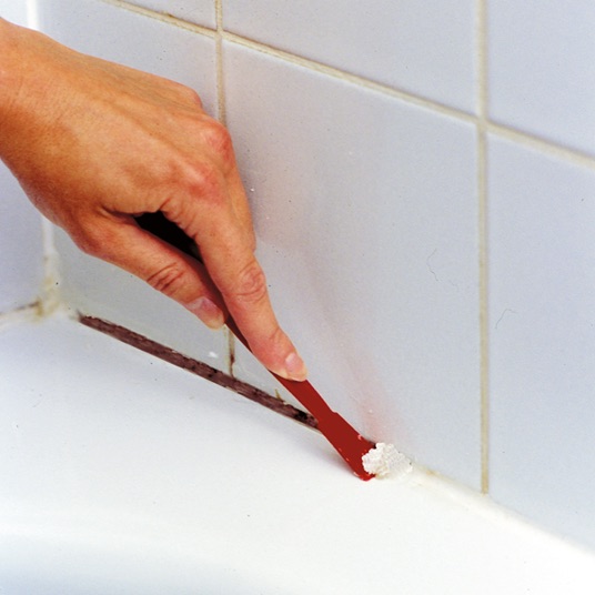 3. Breng HG siliconenkitverwijderaar overvloedig aan op de kitrestanten met behulp van het bijgeleverde kwastje. Laat dit 15 minuten inwerken.