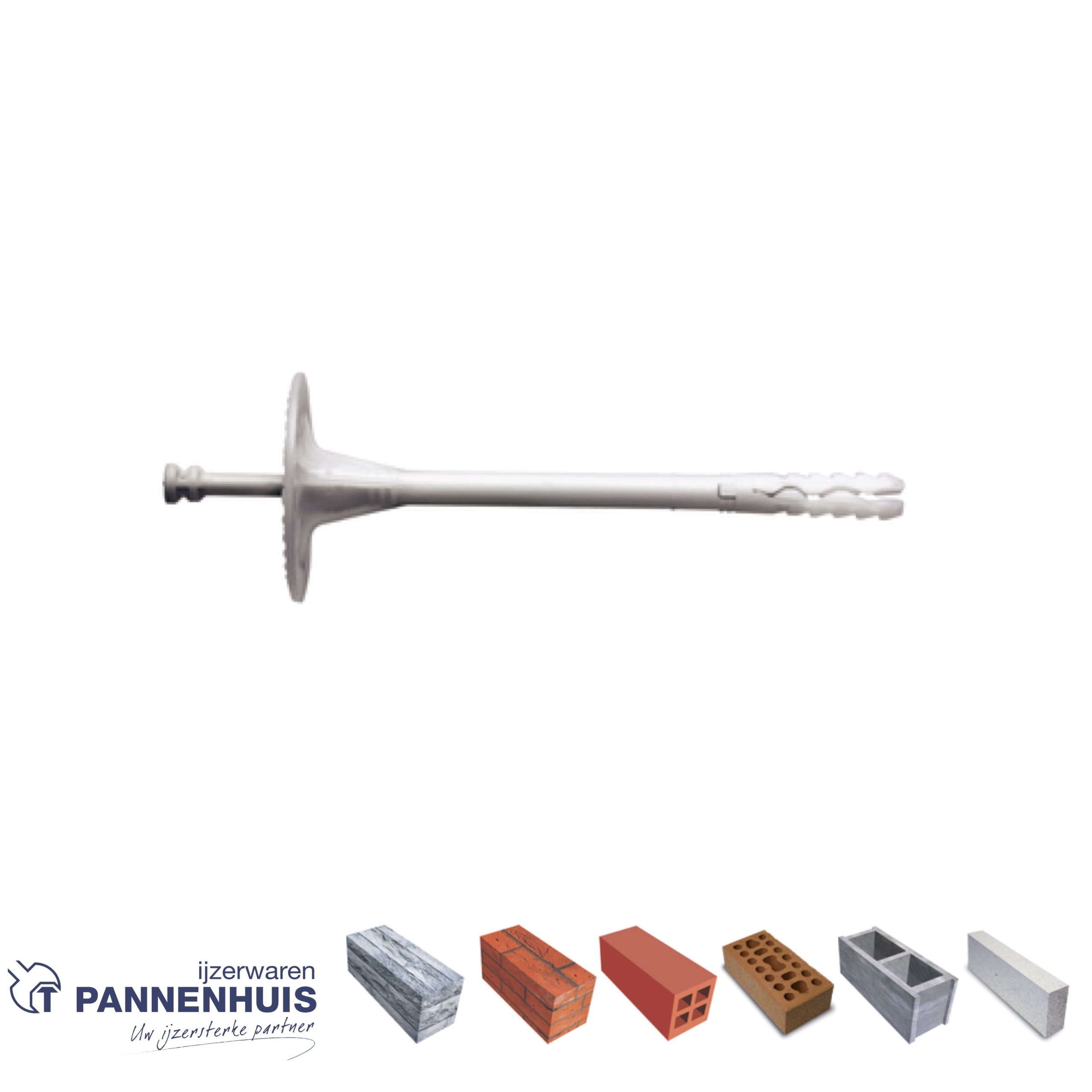 Geschikt voor bevestiging van isolatiepanelen op massieve en holle dragers: steen, beton, massieve baksteen, holle baksteen, licht beton.