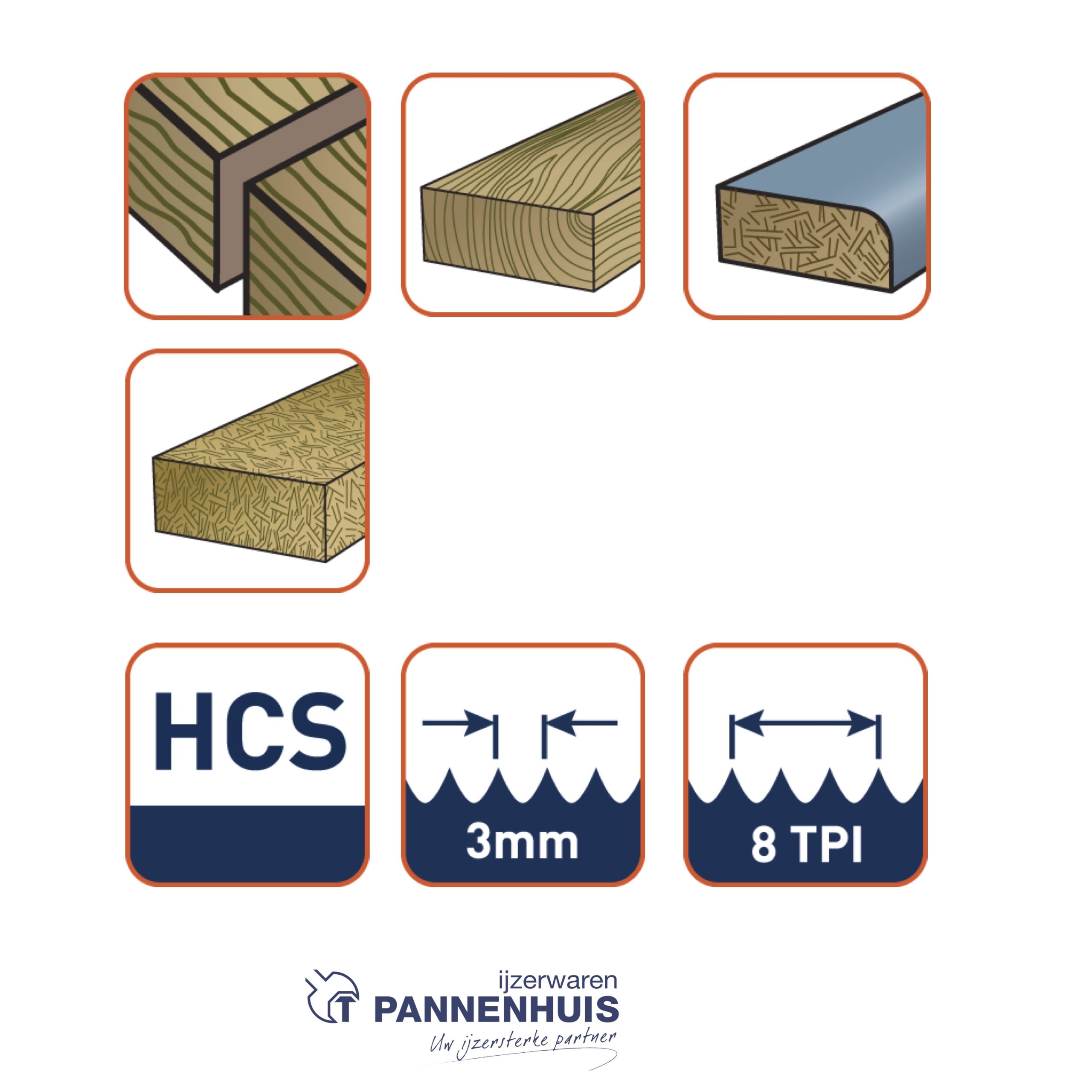 toepassing:zacht hout/platen, dik bouwhout, sandwichmateriaal. uitvoering:HCS, vrijhoek- en tandgeslepen.