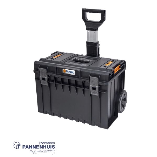 De trolley zorgt voor makkelijk vervoer van koffersysteem 1. De trolley, met een inhoud van 50 liter, kan maximaal 50 KG aan inhoud vervoeren. Is voorzien van duurzame connectors, telescoop handvat, 2 grote rubber wielen en een metalen as. Wanneer het deksel geopend wordt beweegt het telescoop handvat mee naar achteren en zorgt hiermee voor voldoende ruimte om de deksel open te laten staan. Handvat naar beneden 770 mm, omhoog 1035 mm.